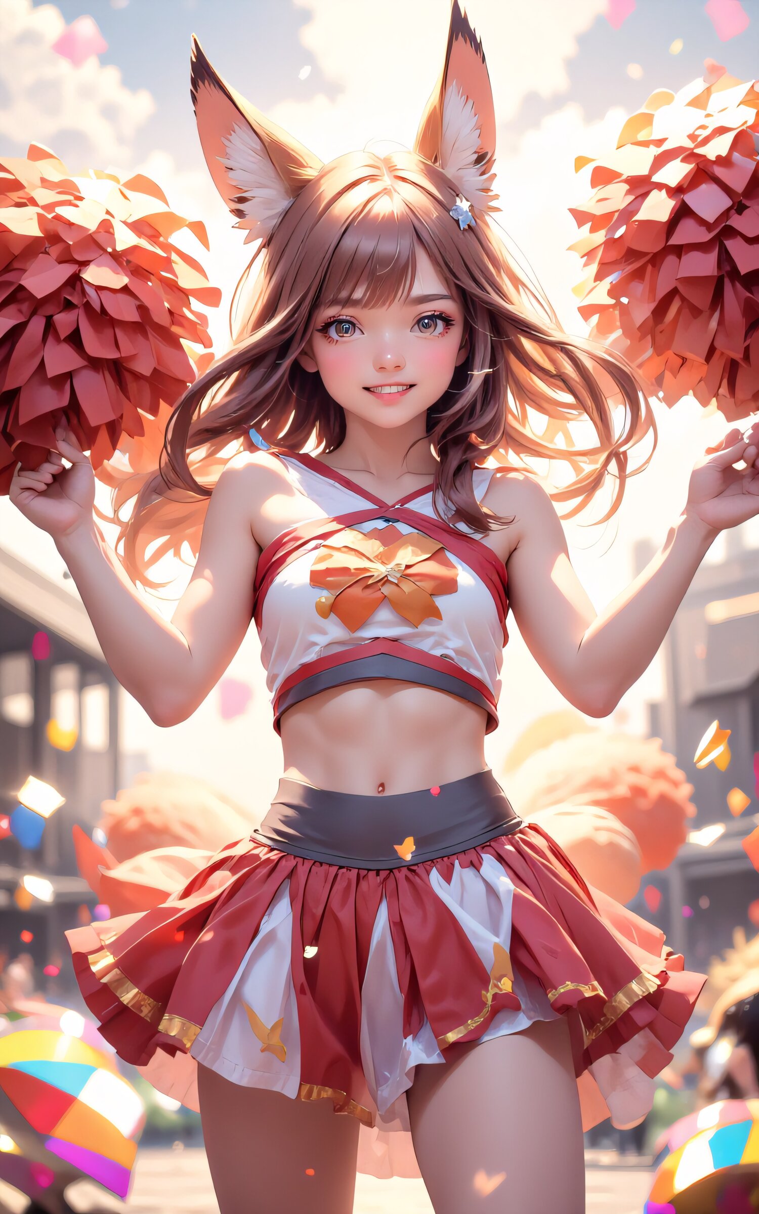 anime style, high resolution, full body, fox-eared girl, long light brown hair, double eyelids, long delicate eyelashes, fluffy fox tail, wearing a vibrant cheerleader outfit with short pleated skirt and crop top, holding pom-poms in both hands, jumping or posing energetically, bright stadium or schoolyard background, confetti and sparkles in the air, cheerful and dynamic expression, soft afternoon lighting, cinematic composition, festive and uplifting Friday atmosphere, visually captivating aesthetic