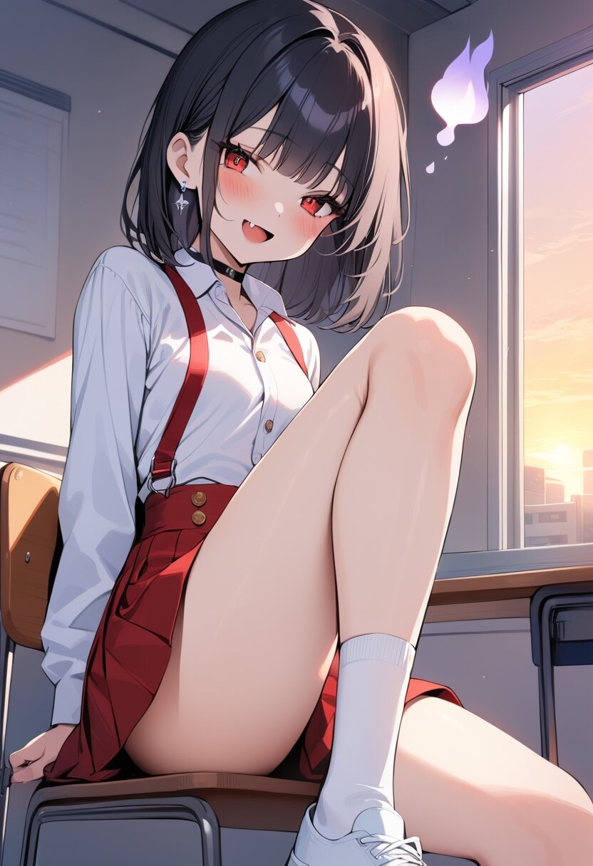 1girl, solo, 15years old, straight hair, bob cut, blunt bangs, black hair, red eyes, ((sharp eyes)), half eyes closed, earrings, choker, (long sleeves, ribbon, shirt, white shirt, skirt, bare legs, thighs, white socks, short socks, Indoor shoes, collared shirt, red mini skirt, buttons, red suspenders, high-waist skirt), (blush), fang, smile, open mouth, (knee up), leaning back, ((hitodama)), (at sunset), indoors, class room, on the school chair,