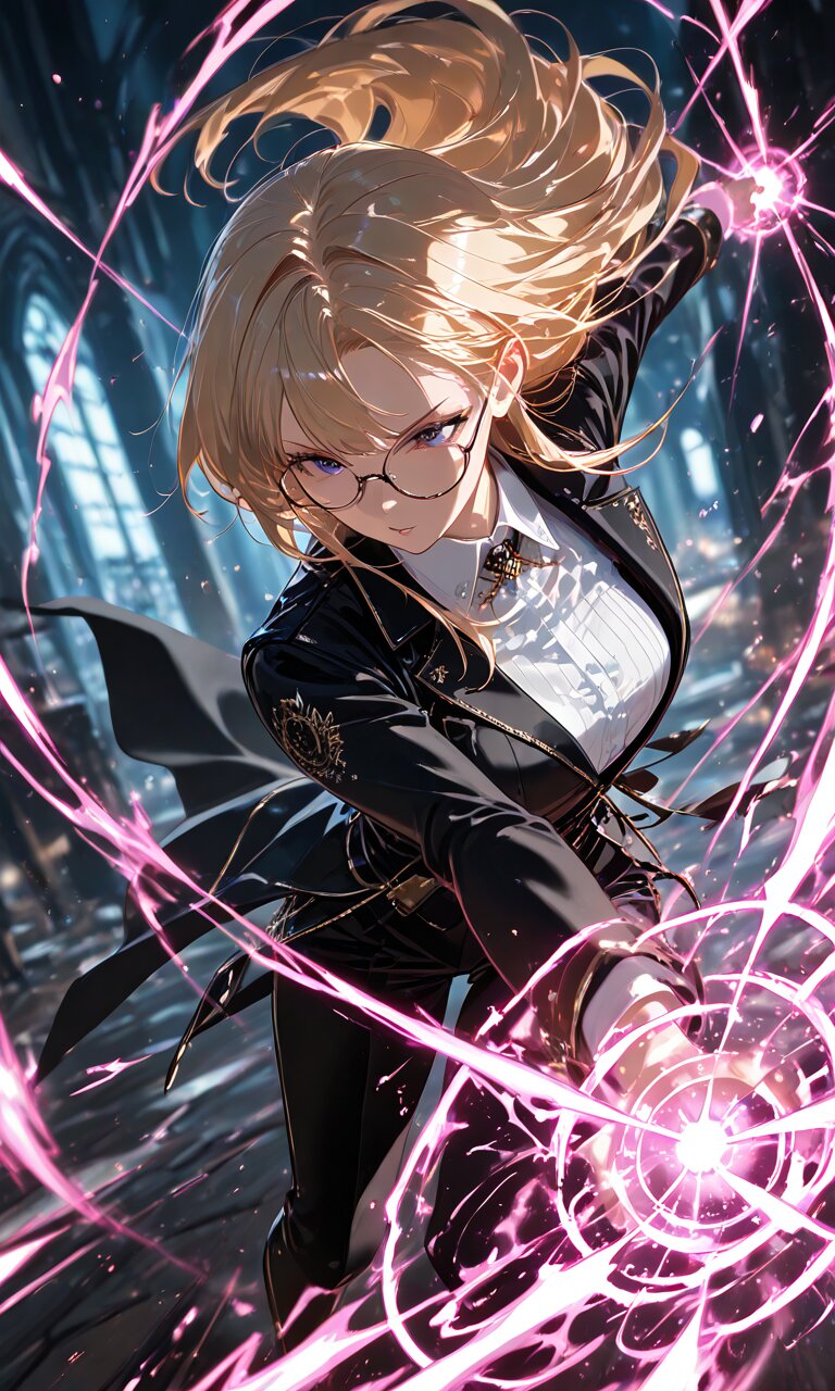 1 lady, long hair, blonde hair, glasses, breasts,(black jacket, white shirt, black pants),,Magic, Attack, Action,