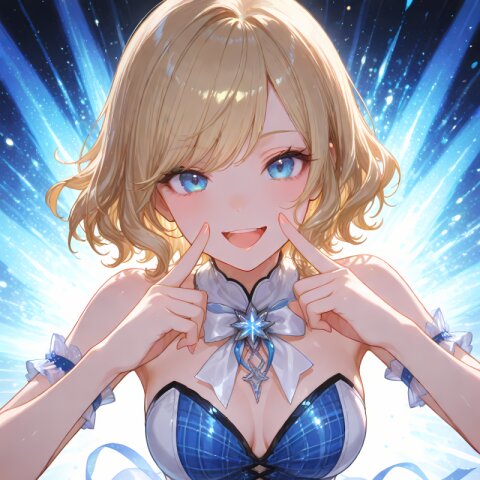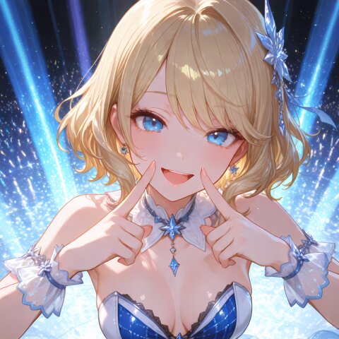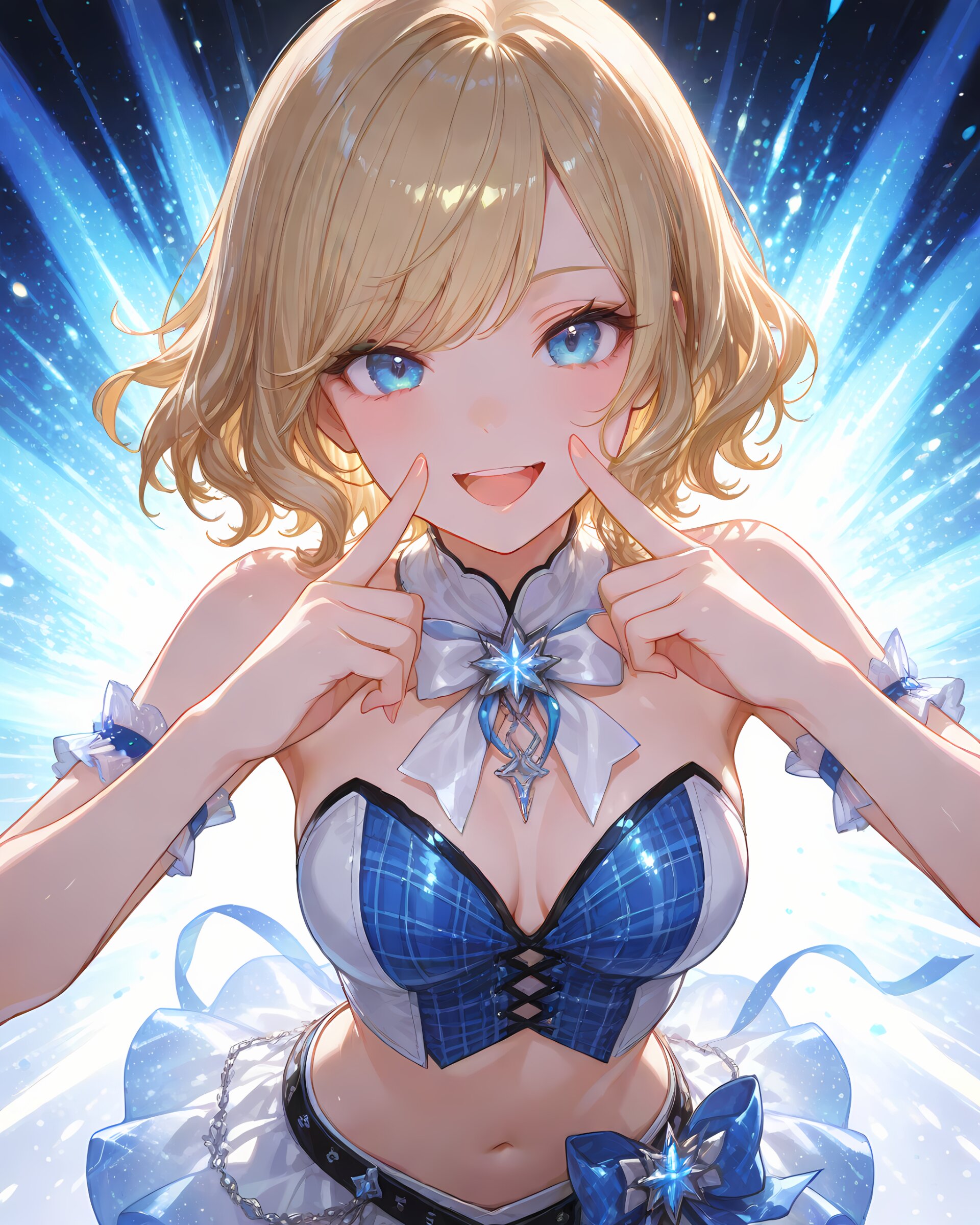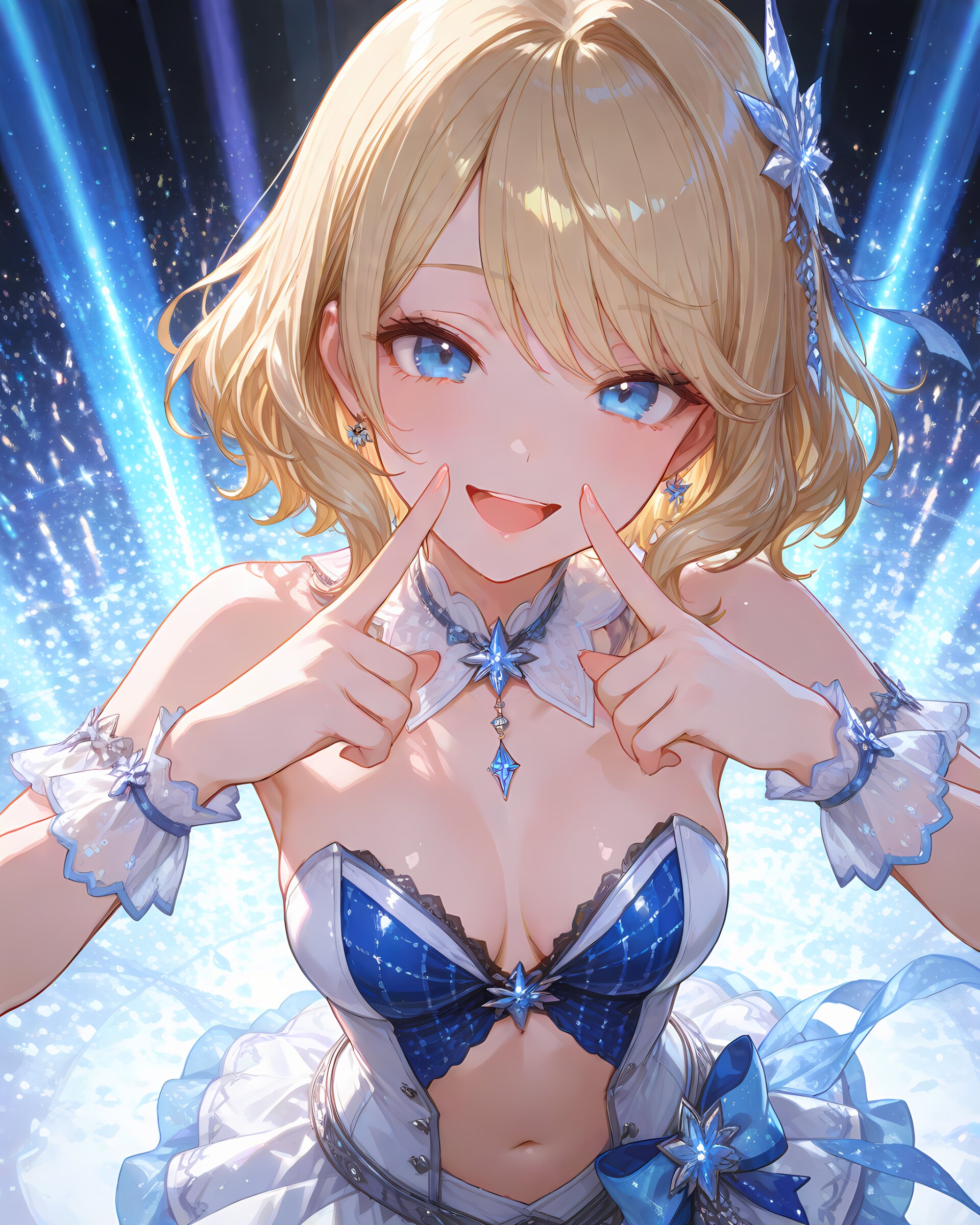 <lora:hyper_sdxl_8_step_lora_f16:1>,, 1girl, fingersmile, looking at viewer, close up, standing in glowing sparkles, shining particles, soft glowing lights, ethereal, glittering background, BREAK 18 years old, girl, short hair, wavy blonde hair, swept bangs, medium breasts, slender, frosty blue eyes, idol, bare navel, sexy, smile, open mouth, BREAK masterpiece, amazing quality, best quality, very aesthetic, ultra-detailed, 8K, newest, Japanese, vivid,