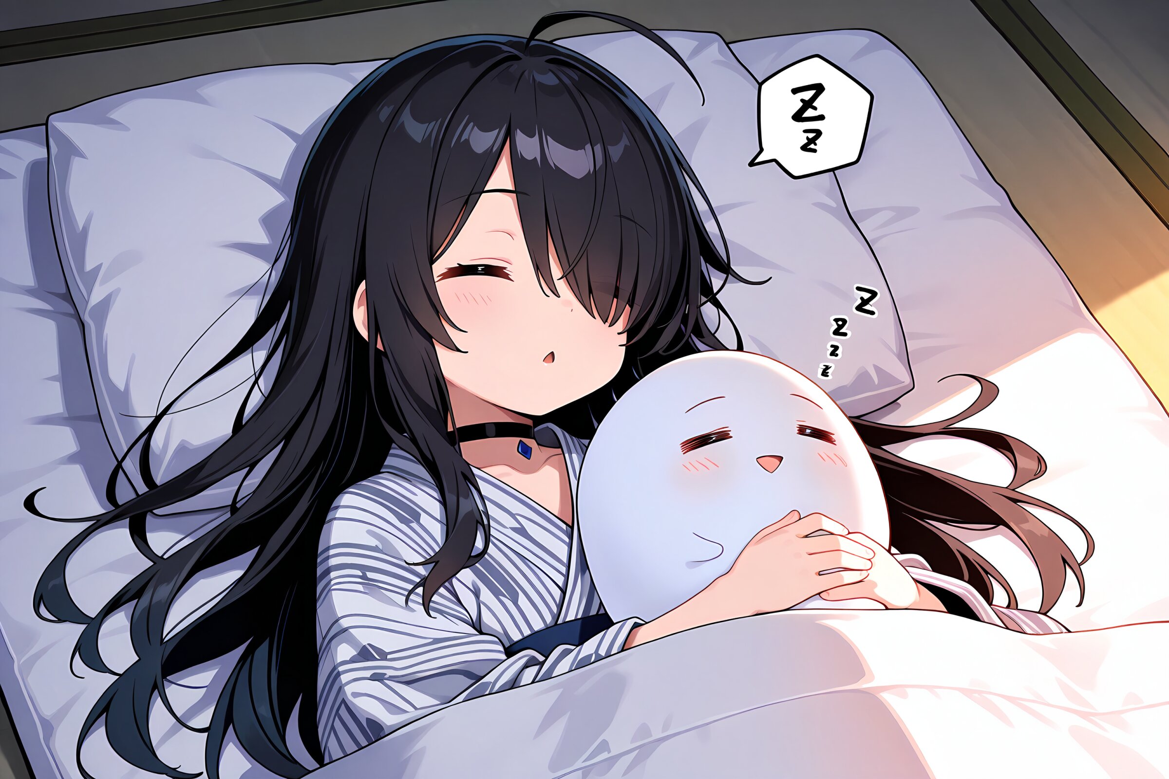 1 little girl, solo, upper body, diagonal angle, masterpiece, best quality, amazing quality, very aesthetic, black hair, long hair, ahoge, (hair over one eye:1.2), =_=, chestnut mouth, smile, cheerful, zzz, spoken zzz, choker, yukata, lying, sleeping, holding ghost, =_=, futon, pillow,