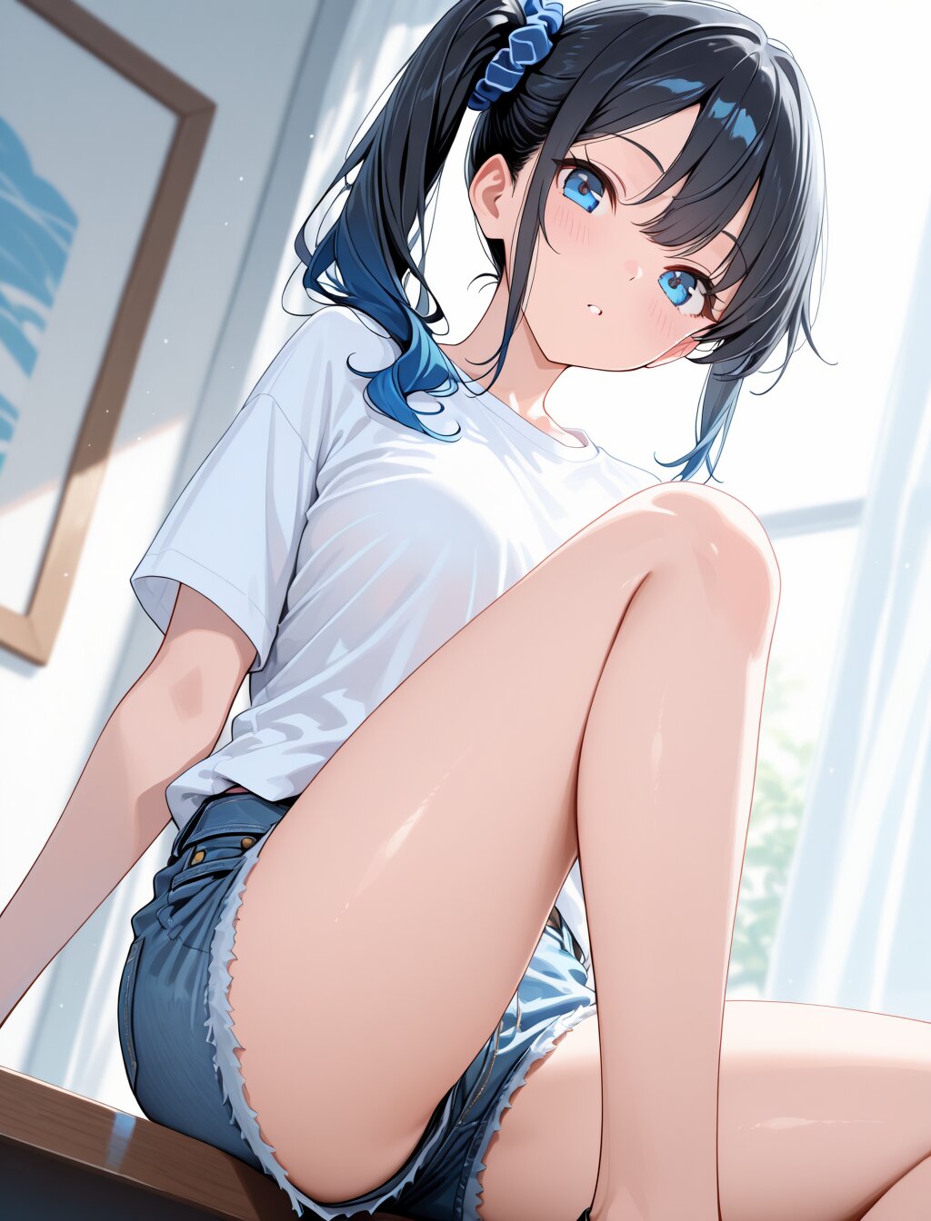 masterpiece,best quality,ultra detailed,1girl,solo,black hair,blue tips,(Side ponytail:1.2),blue eyes,blue_Scrunchie,beautiful legs,beautiful thigh, BREAK T-shirt,denim shorts,