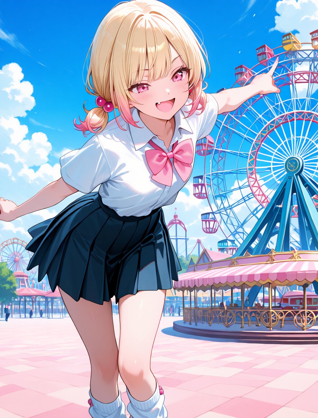 masterpiece,best quality,ultra detailed,1girl,solo,blonde hair,pink tips,pink bow,hair_bobbles,bob cut,low twintails,short twintails,pink eyes,fang,school uniform,short sleeve,loose socks,beautiful legs,beautiful thigh,laughing, BREAK ferris wheel,amusement_park,pointing_away,leaning_forward,