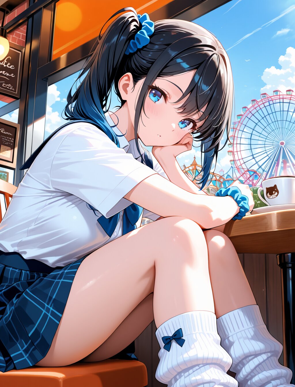 masterpiece,best quality,ultra detailed,black hair,blue tips,(Side ponytail:1.2),blue eyes,blue bow,school uniform,short sleeve,blue_scrunchie,loose socks,beautiful legs,beautiful thigh, BREAK ferris wheel,amusement_park,sitting,coffee,cafe terrace