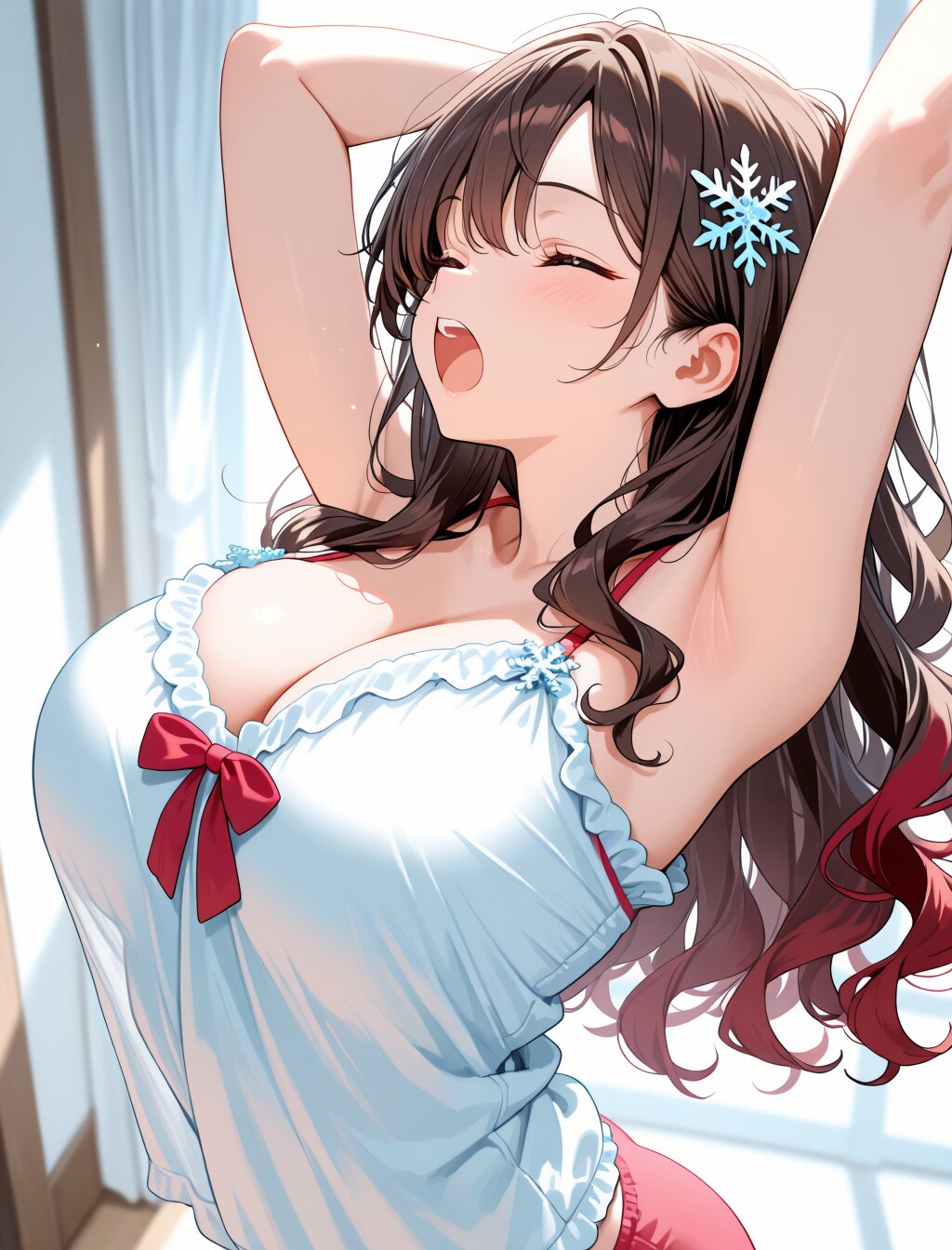 masterpiece,best quality,ultra detailed,1girl,solo,brown hair,red tips,red bow,wavy hair,long hair,big breast,beautiful legs,beautiful thigh,snowflake_hair_ornament, BREAK loungewear,yawn,close_eyes,arms_up,arched_back,