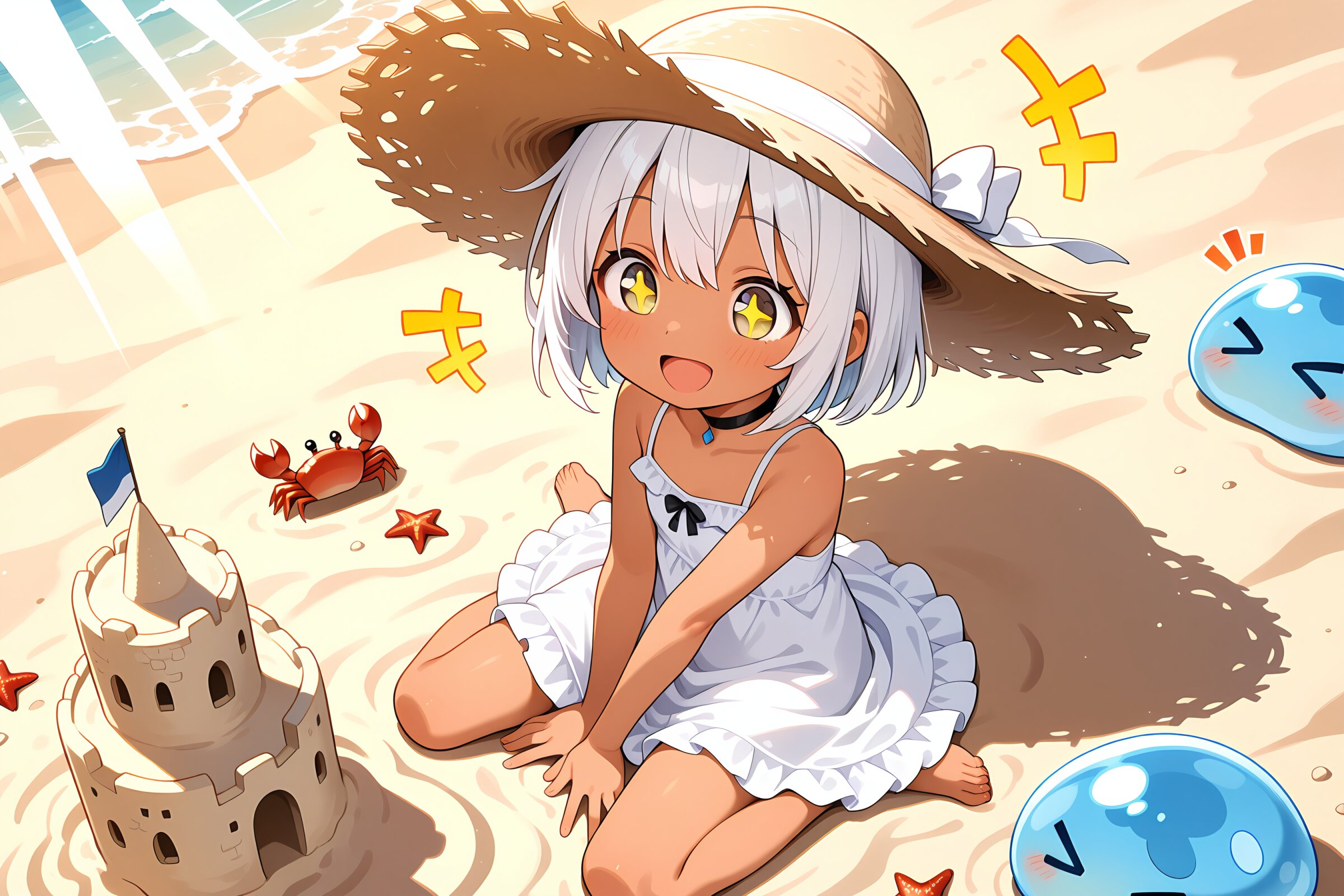 1 little girl, solo, diagonal angle, masterpiece, best quality, amazing quality, very aesthetic, white hair, short hair, yellow eyes, +_+, open mouth, smile, cheerful, +++, notice lines, choker, white summer outfit, straw hat, tan, slime, > <, crab, wariza, making sand castle, sand beach, summer, sun, sunlight,