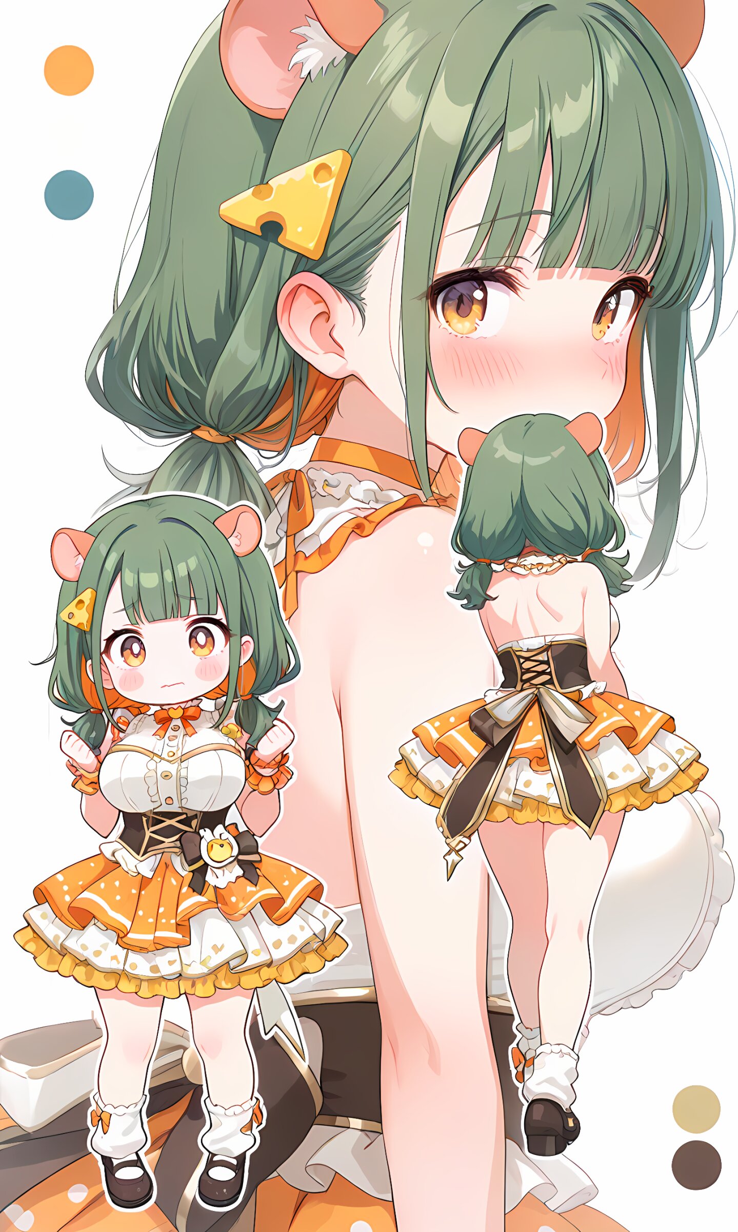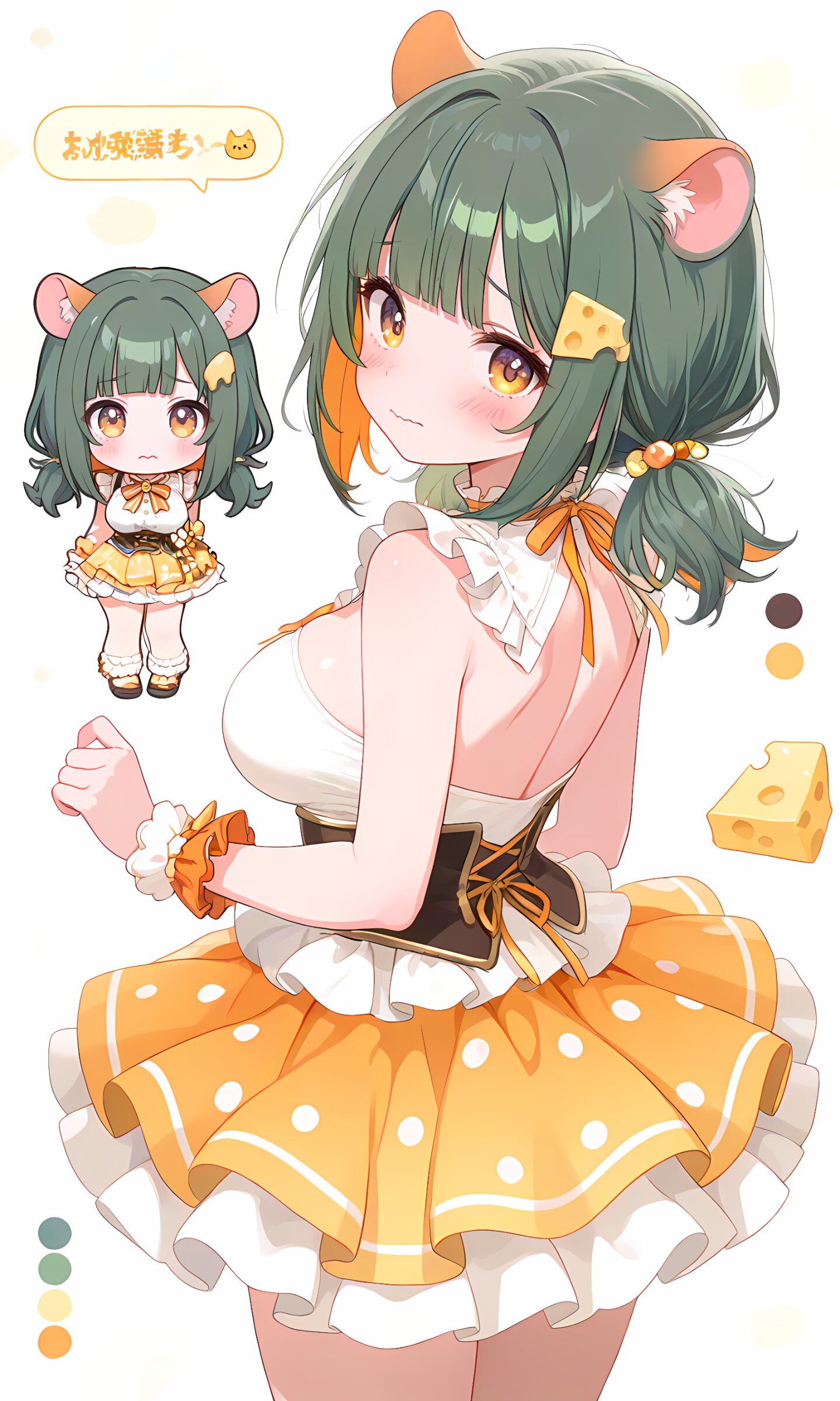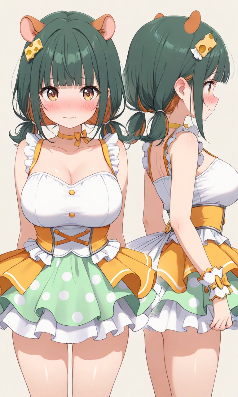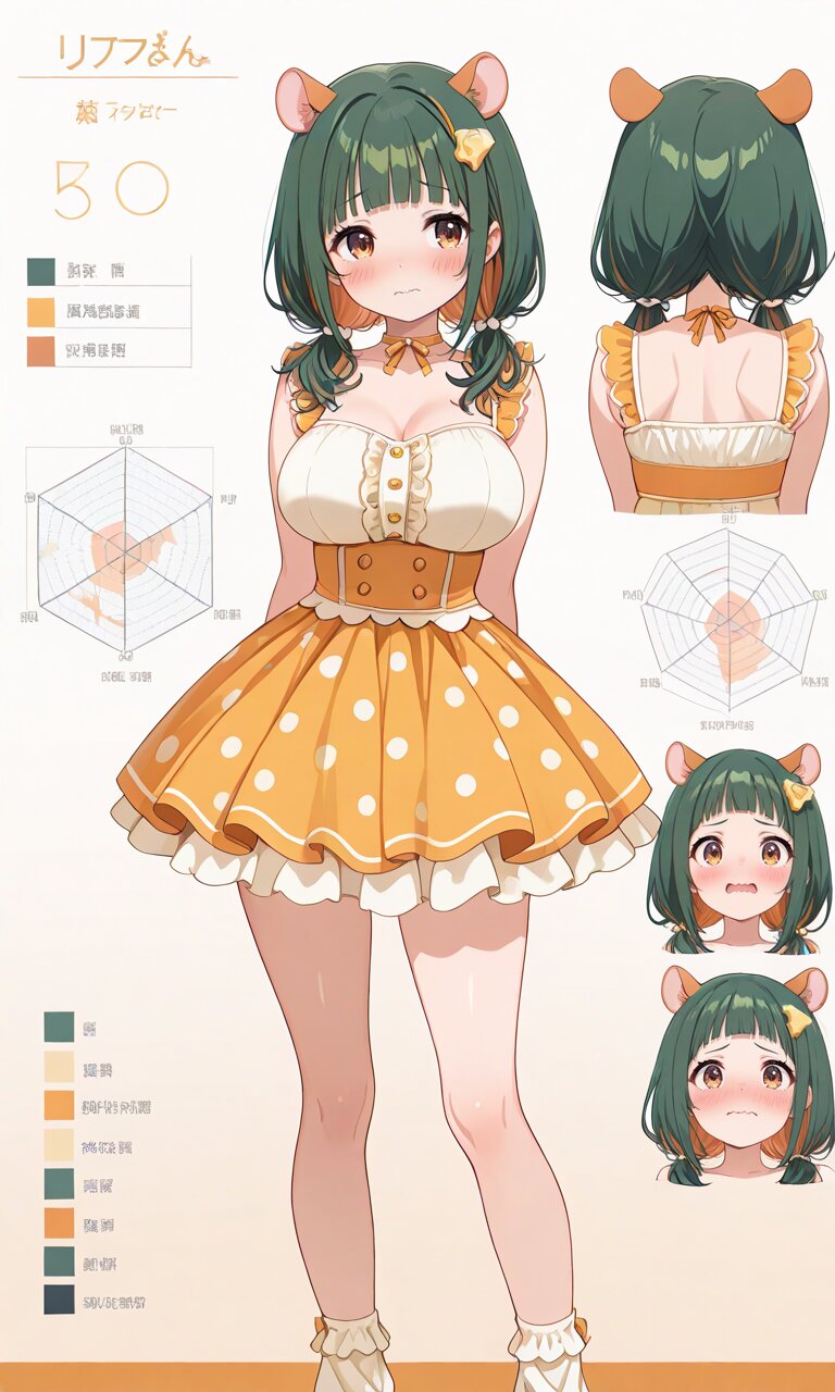 【外見的特徴】緑色の髪に橙色(インナー)を少し加えたツートンカラー、チーズのヘアアクセ(安定して出せない)、ハム耳(髪色と同じになりやすい)、巨乳、アイドル系衣装にミニスカートはドット柄