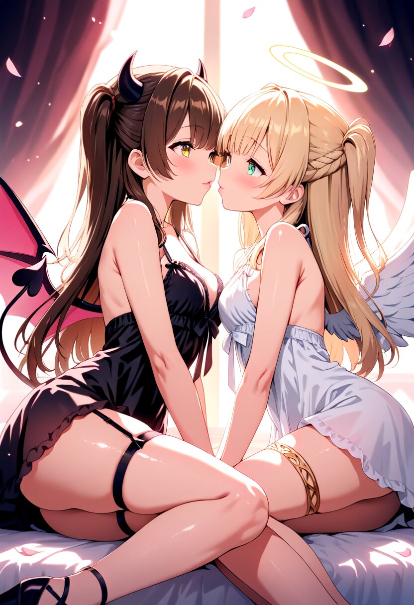 (2girls facing each other, imminent kiss, ) from side, BREAK (1girl, petite, cute, angel, blonde hair, long straight hair, braid, angel halo, tareme:1.4, aqua eyes, pink lips, embarrassed, blush, white cage dress, huge back ribbon, angel wings, medium breasts, cross strap shoes, ) BREAK (1girl, cute, petite, succubus, dark brown hair, two side up, demon horns, tareme:1.4, dark yellow eyes, mole left under eye, seductive smile, pink lips, glossy lips, black frilled babydoll, large breasts, overhang,demon wings, demon tail, garter straps, highhighs, leg ring, ) BREAK lily garden, lily petals drifting, pastel background, bokeh:1.4, Dreamy Blur, light particles,