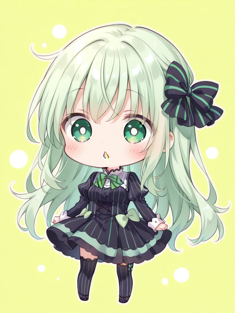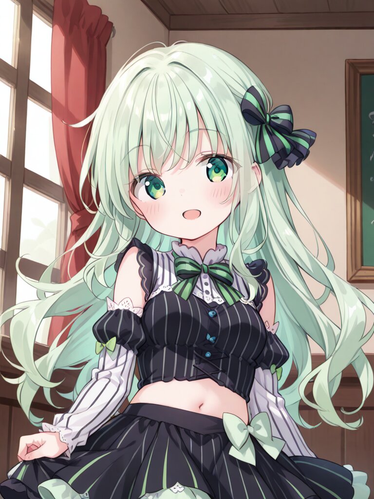 mchara_misha, 1girl,short black white sleeves,pale green very long hair,green eyes,hair bow,vertical-striped black dress,green bow,pinstripe pattern,white lace,midriff, <lora:CHARA.MyCHRmsa_illustrious_1pic.ep9:0.8>