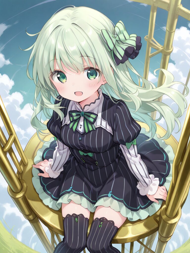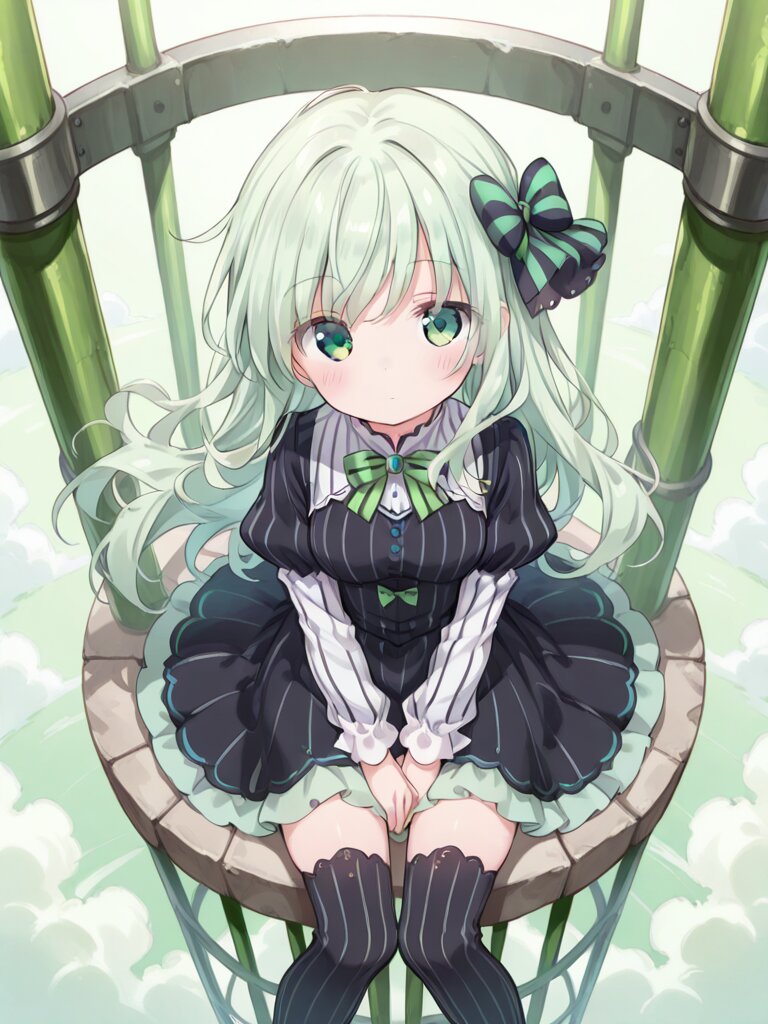mchara_misha, 1girl,solo,long sleeves,pale green very long hair,green eyes,hair bow,vertical-striped black dress,juliet sleeves,black striped thighhighs,green bow,vertical-striped thighhighs,pinstripe pattern,<lora:CHARA.MyCHRmsa_illustrious_1pic.ep9:0.85>from above, sitting,metal frame tower,cloudy sky,