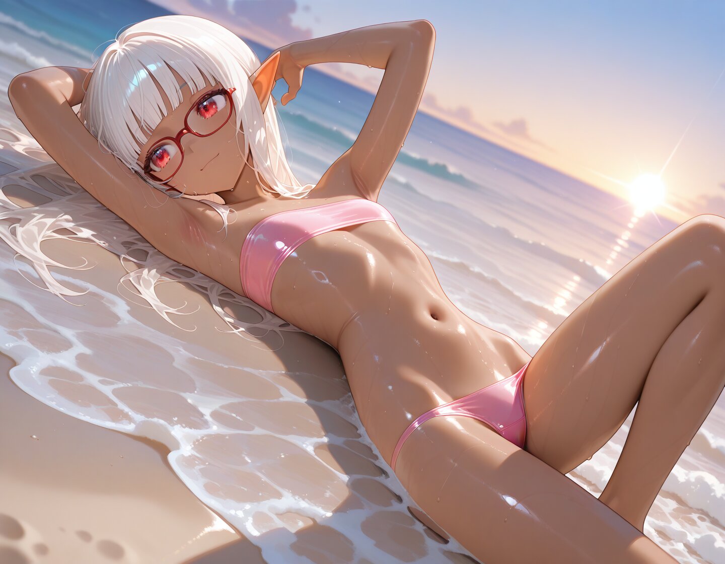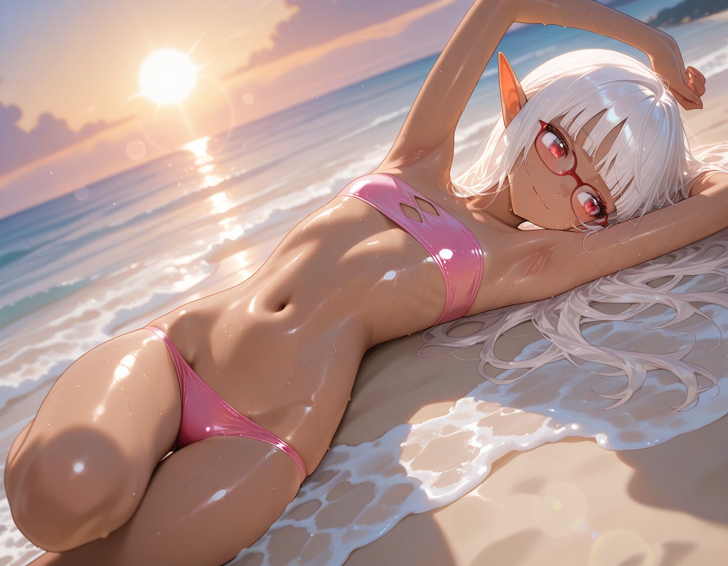 1girl, sensitive, (beautiful eyes, detailed eyes, shiny skin), looking ahead, solo, cute, beach, sunset, lens flare, sand, waves, ocean, partially submerged, (dark skin, red-framed eyewear:1.2), white hair, straight hair, blunt bangs, medium hair, long hair, flat chest, red eyes, elf, hair spread out, pink bandeau, pink bikini bottom, lowleg, lying, on beach, on back, armpits, arms up, one knee up, navel, (sweat:1.2), wet, wet swimsuit, wet hair, light smile, masterpiece, best quality, amazing quality,