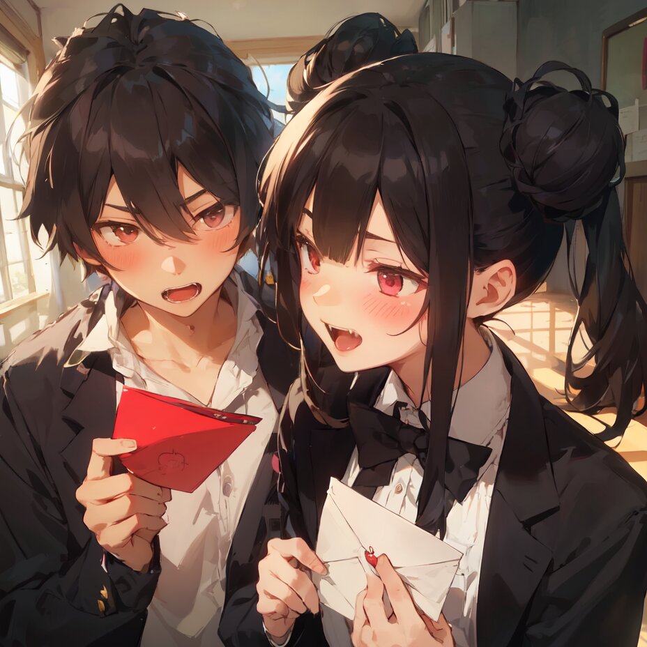 masterpiece, best quality, 2 body, Detectives, highschoolers, Partner, Flirting, brake, 1boy, serious, good, high school boy, Close mouth, brake, 1girl, canines, Fangs, high school girl, hand a love letter to boy, kawaii, black double bun, blush, open mouth0.5,