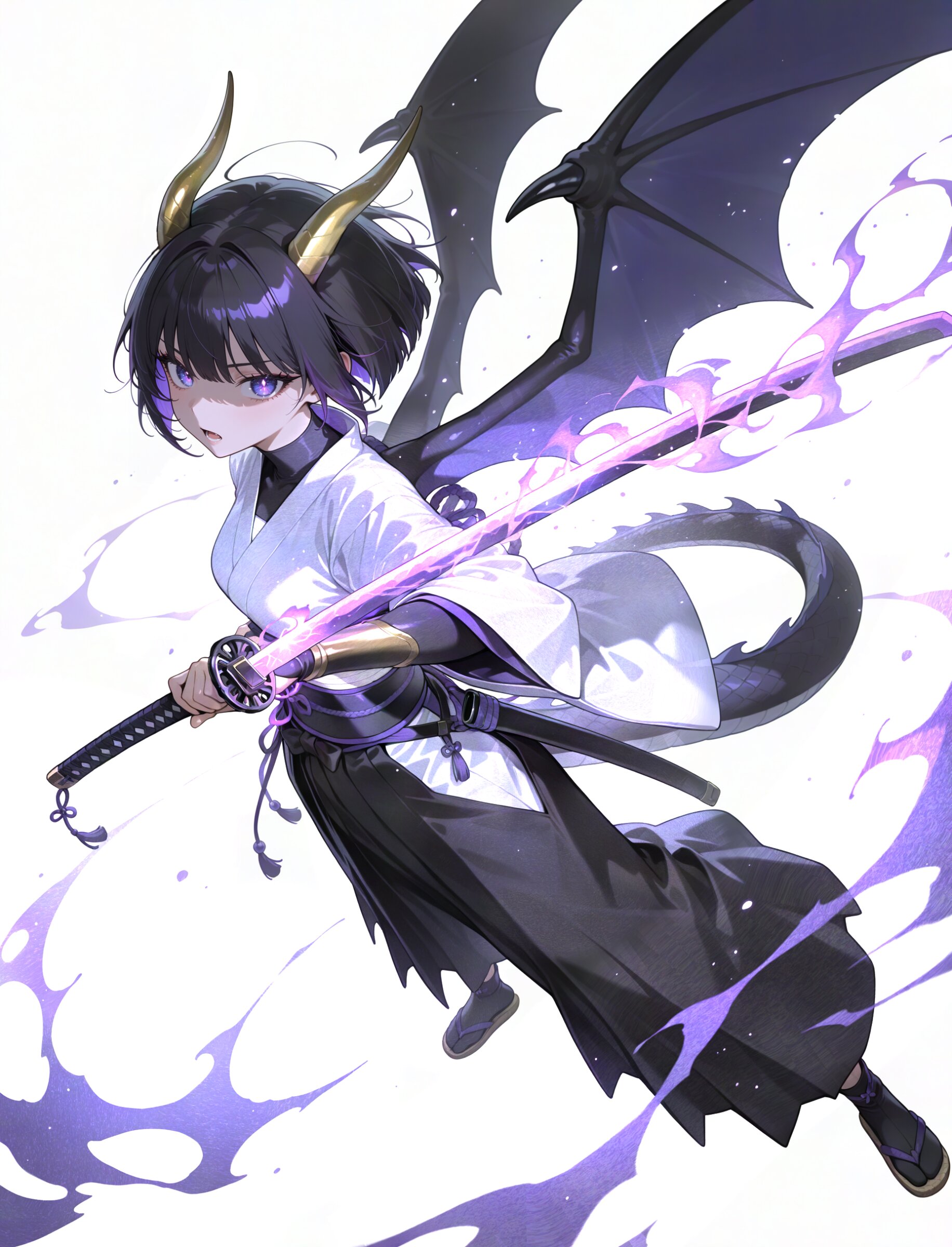 foreshortening, (portrait:1.0) white background, sumi-e, faux traditional media, color ink \(medium\), painting \(medium\), calligraphy brush (medium), monochrome, spot color, 1dragon girl, solo, dutch angle,first person view, looking at viewer, dragon girl, 16yo, (2dragon gold horns attached to the head:1.2), (dark purple black hair:1.2) (very short hair:1.0) (bob cut:1.0) (pixie cut:0.4), (violet eyes:1.2) beautiful iridescence eyes, cute, cool, (muscle,buff well-built body,ultra-detailed muscle:0.5) , first-rate female bodies, perfect body medium breasts medium hips cute, a dragon tail (2long black dragon wings on back:1.2), dark brown ankle-length hakama, (overskirt:1.0) White Japanese Clothes, sarashi inner, (White wide sleeve:1.0) purple and white stripe obi, bracer, straw sandals, tabi, mysterious face, calm, expressionless, (light smile:0.0), (empty eyes:0.6), shaded face, (mysterious smirk:0.5), open mouth, mysterious atmosphere, glowing japanese short sword, (japanese sword action:1.2), glowing sword katana battoujutsu stance, (ready to draw,scabbard,unsheathing, holding sheath:1.0) glint, (swirling purple energy,energy magic,energy:1.2), glowing eastern dragon purple aura, assassin ninja action, ink wash painting, An illustration with line art drawn using a brush, featuring dynamic movement lines expressed with thick sumi ink strokes. super fine concept art, hard surface, 8K, unreal engine, masterpiece, best quality, amazing quality, very aesthetic, absurdres, you can add scenery, (volumetric lighting), To make the background more distinctive. professional art lots of details, , overexposure, sumie effect style, 4ur4_illu,shiny, glowing, glowing particles, glowing light particles, light particles, black flame, <lora:noline (1):-0.5> <lora:sdxl2-flat2-512b:0.15> <lora:facelightup_xl_v10:0.5> <lora:V2_yakumo_alchemy:0.5> <lora:Aura_illu:0.1>