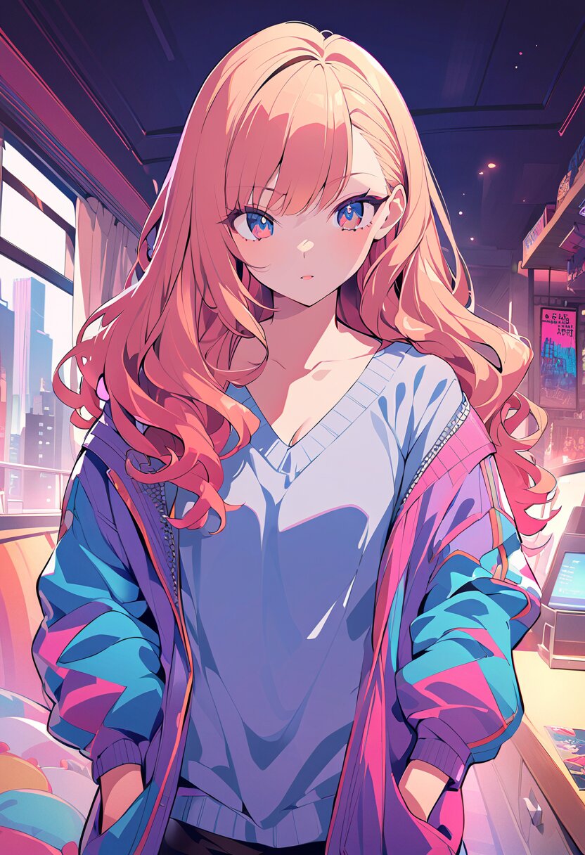 masterpiece, best quality, beautiful detailed eyes, ultra-detailed, finely detail, highres, perfect anatomy, 1 cute girl, (room:1.5), long v neck sweater, BREAK (City Pop), city pop art, (urban pop art), retro shades,Tatsuro Yamashita style, (retro pop), (pop art), wavy hair, pastel colors, vivid, (Neon color), Hiroshi Nagai style, city pop record jacket, A LONG VACATION, FOR YOU, City Pop Color, eizin suzuki style, japanese city pop, seizou watase style, 80s, 80s fashion, ,