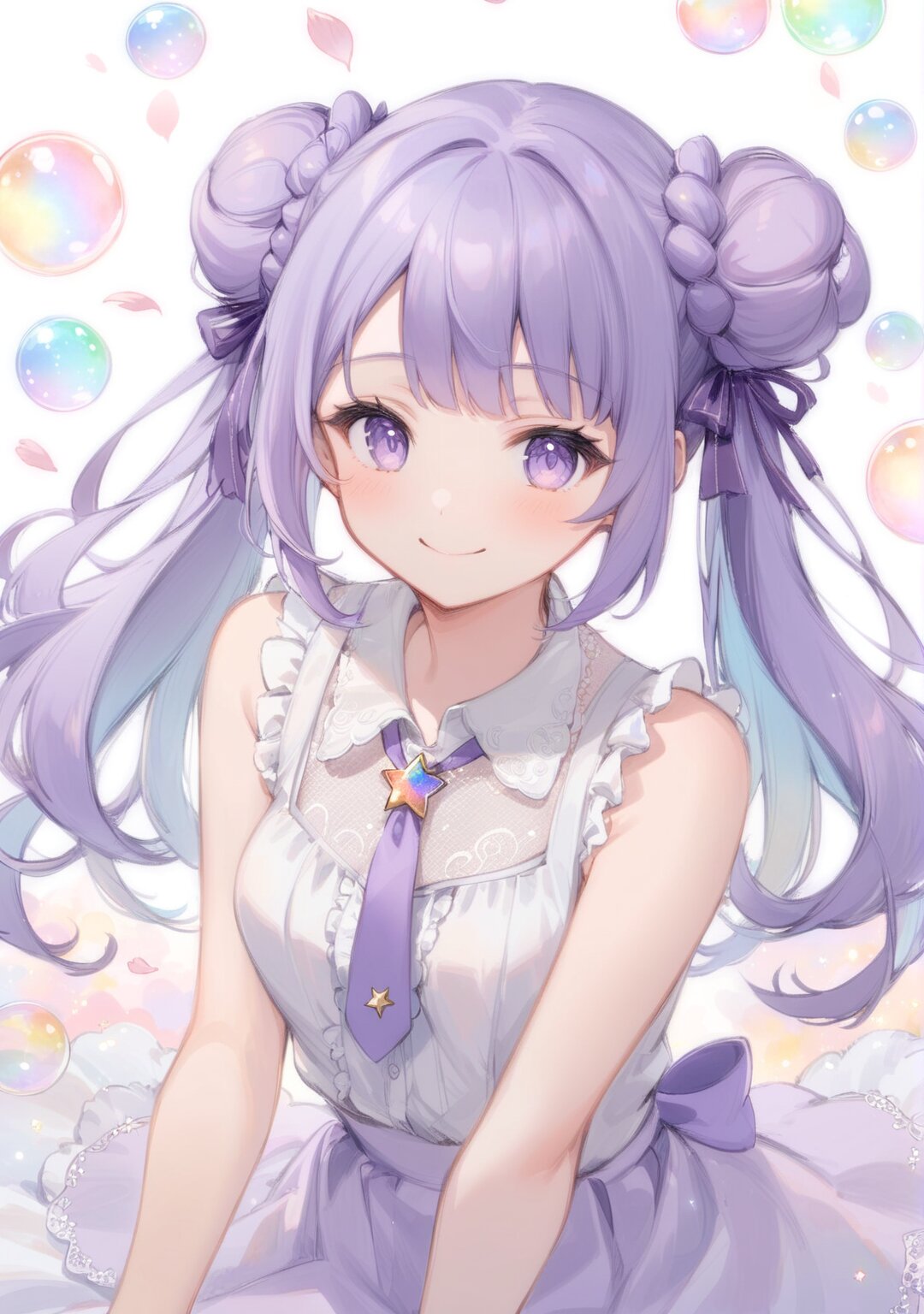masterpiece, best quality, solo, upper body, centered composition, top-down view, looking at viewer, cute anime girl smiling gently, wearing a light white sleeveless blouse with lace collar and lavender ribbon tie, soft lavender pastel flare mini skirt with subtle chiffon layers partially visible, long silky purple hair with light blue inner highlights in twin buns, sparkling purple eyes, star pendant necklace, ribbon hairpin, surrounded by floating translucent soap bubbles, pastel dreamy background, soft glow, sparkles, watercolor texture, thin delicate lineart, matte finish, floating petals, gentle light, fluffy textures, subtle rainbow tones, magical atmosphere