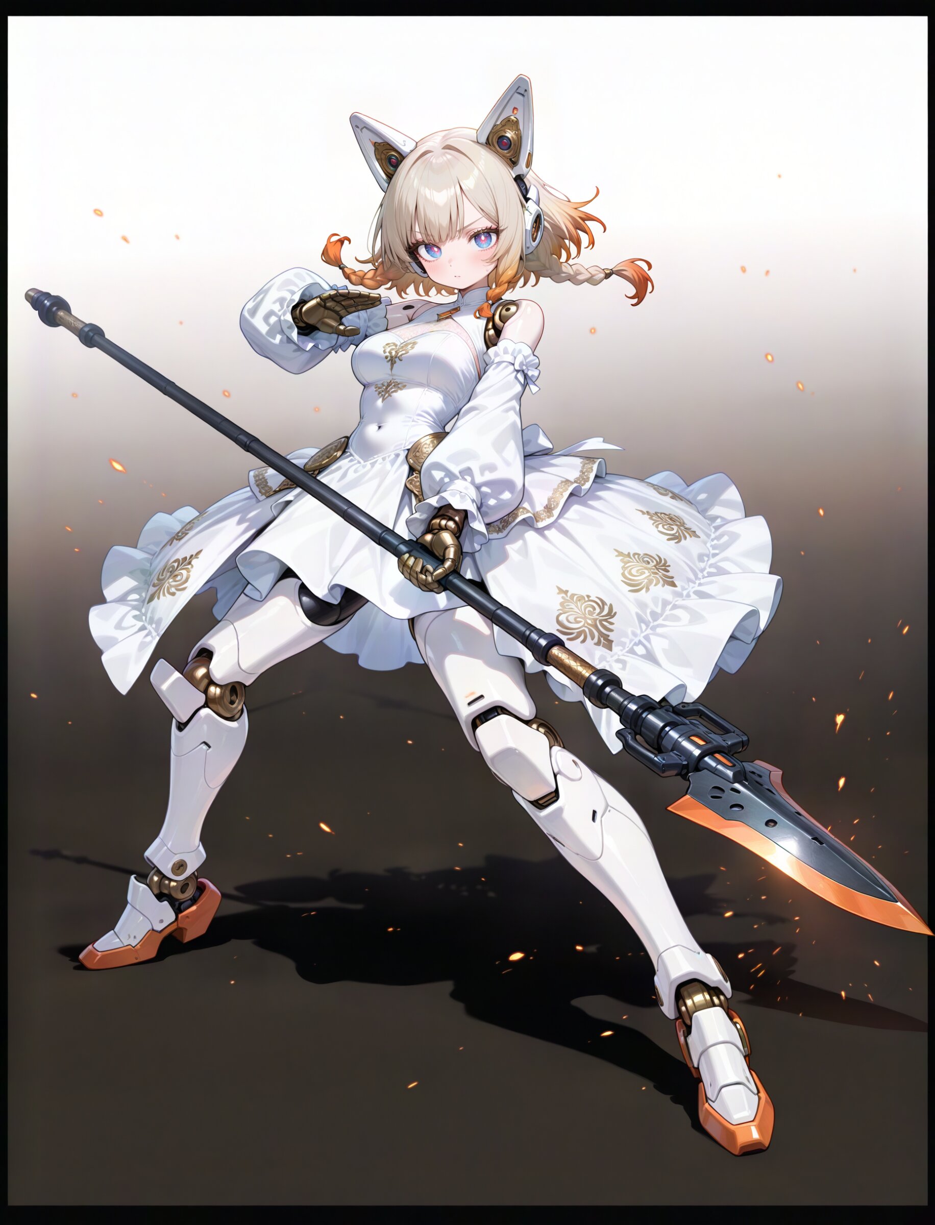 1girl, huge cool polearm in hands, holding huge cool weapon mechanism, machine, , from front, focus crotch (25 years old:1.0), (medium breasts:1.2), (platinum blonde hair, darkorange colored tips, medium hair, low-braided hair husky hair , :1.0), (beautiful face:1.1), (clear white small eyes:1.0), pink pupils , fighting stance, aiming, mechanical hands, mechanical legs, robot ears, neon trim, medieval times fantasy world, (cybernetic gynoid:1.0), (mech suit:1.0), (white gothic cuirass:1.0), (doll joints:1.0), (white gorgeous modest wizard's dress skirt:1.1), glossy black body with metallic luster cyborg, (Decorative embroidery:1.0), (white gorgeous dress:1.1), (overskirt:1.0), (white sleeve:1.2), embers, gradient background, black border super fine concept art, hard surface, 8K, masterpiece, best quality, amazing quality, very aesthetic, absurdres, professional art lots of details, , overexposure, sumie effect style, <lora:noline (1):-0.5> <lora:sdxl2-flat2-512b:-1.0> <lora:facelightup_xl_v10:0.5>