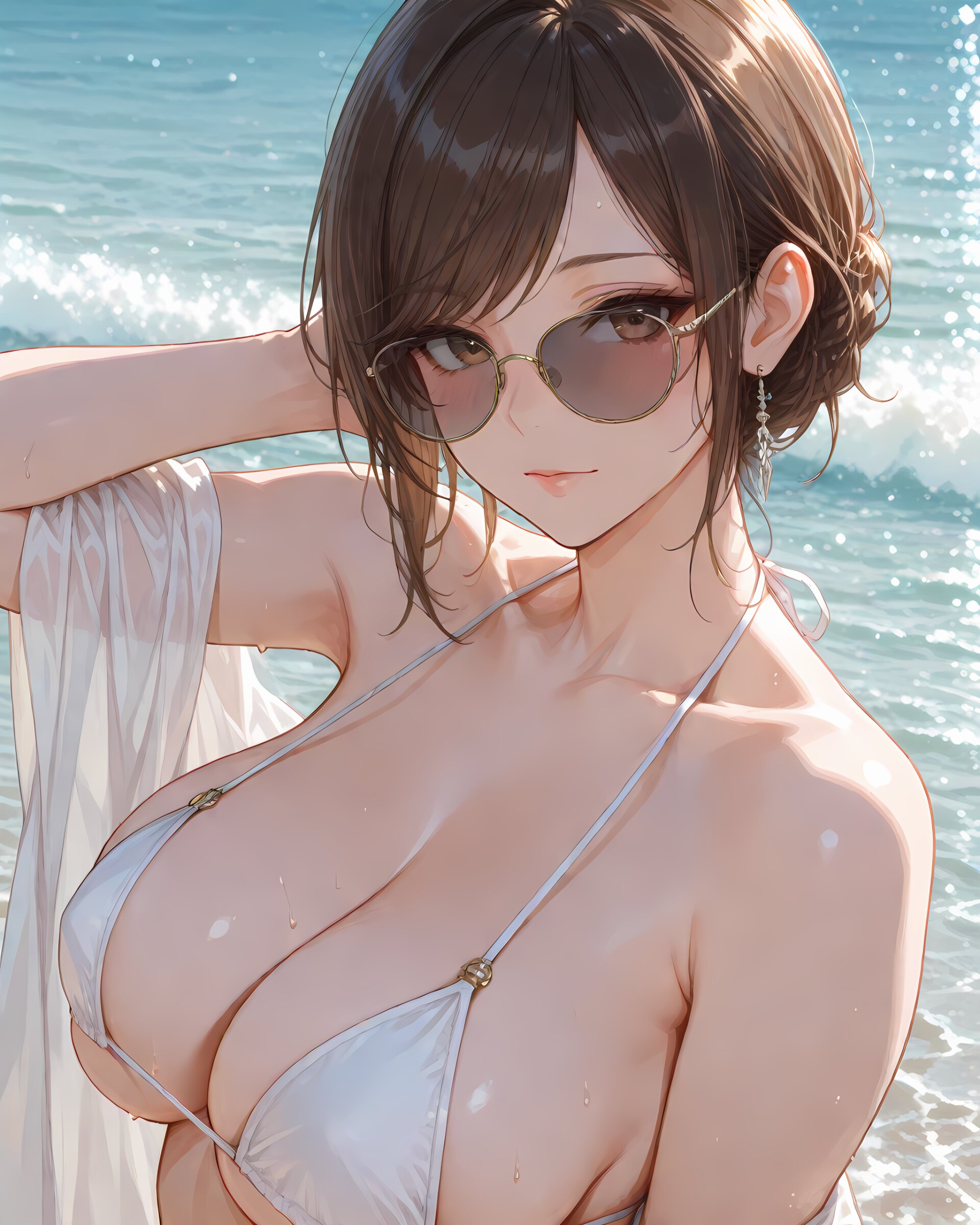 <lora:hyper_sdxl_8_step_lora_f16:1>,, 1girl, sea, wave, elegant pose, looking over shoulder, focus face, close up, BREAK beautiful lady, Married woman, 30 years old, (brown hair), swept bangs, large breasts, micro black bikini, sun glasses, blush, BREAK masterpiece, amazing quality, best quality, ultra-detailed, 8K,