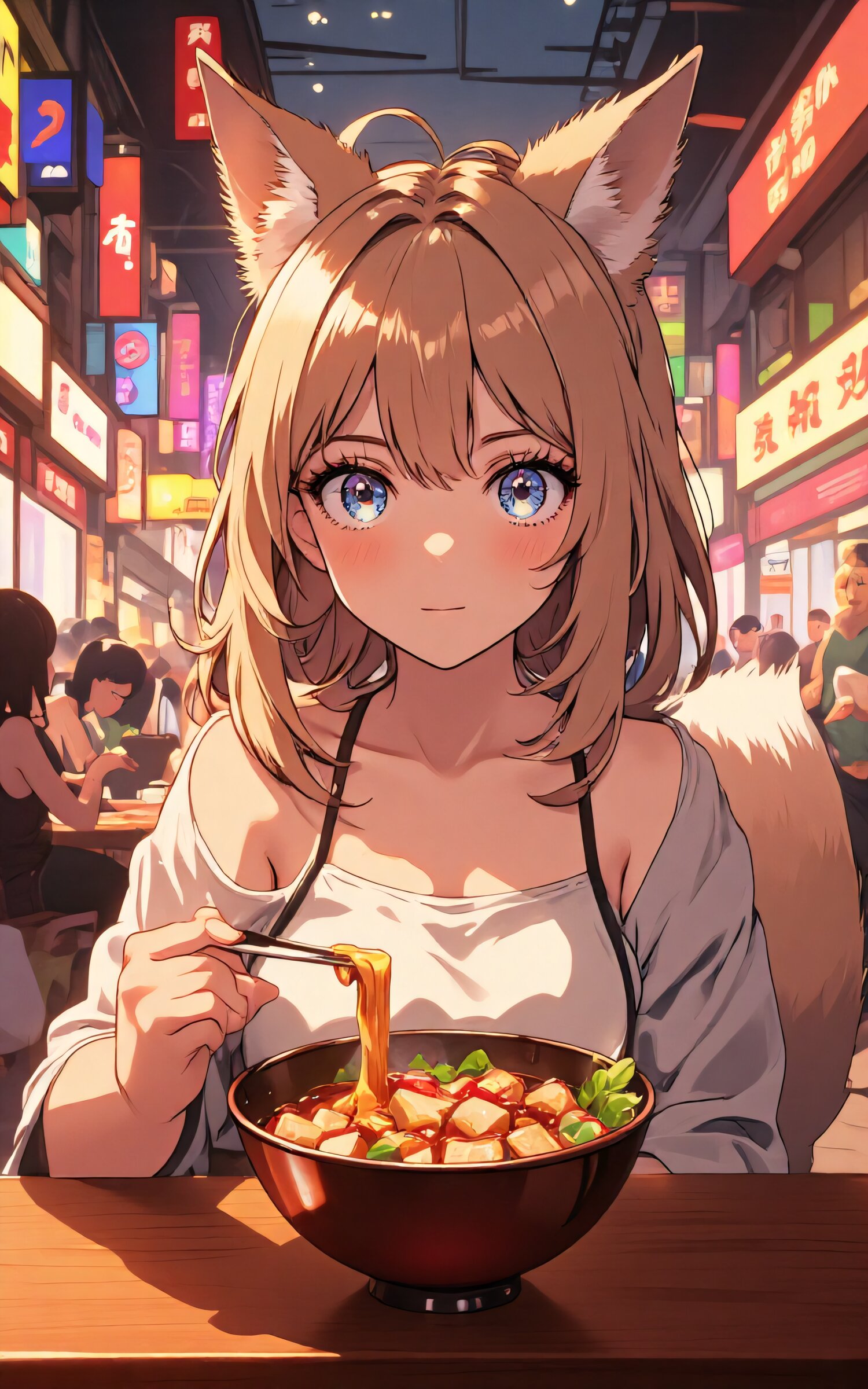 anime style, high resolution, full body, fox-eared girl, long light brown hair, double eyelids, long delicate eyelashes, fluffy fox tail, sitting at a food court table, holding a steaming bowl of mapo tofu, chopsticks in hand, slightly flushed cheeks from the spiciness, casual modern outfit, lively food court background with signs and people, warm lighting, cheerful and hungry expression, cinematic composition, visually vibrant and cozy atmosphere