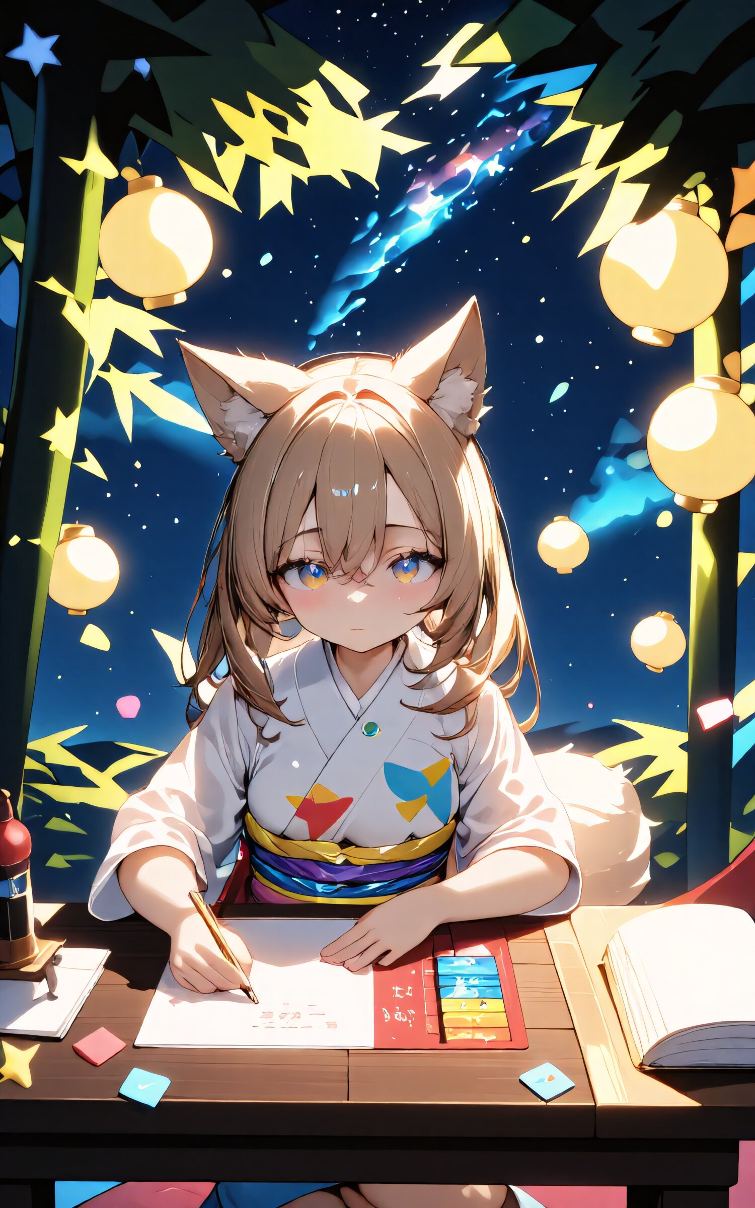 anime style, high resolution, full body, fox-eared girl, long light brown hair, double eyelids, long delicate eyelashes, fluffy fox tail, sitting at a wooden desk under a bamboo tree, writing a wish on a colorful cutted tanzaku paper, many tanzaku scattered on the desk and hanging from the bamboo branches, wearing a yukata with star motifs, soft lantern light illuminating the scene, night sky with stars and the Milky Way in the background, gentle and thoughtful expression, cinematic composition, visually poetic and festive atmosphere