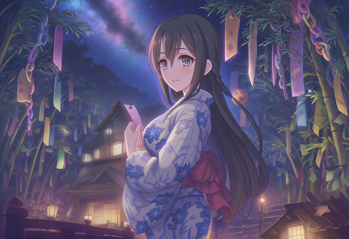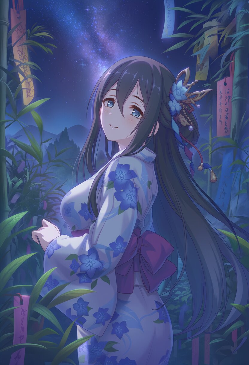 {{{highly detailed}}}, {{official style}}, {{game cg}}, style of ai-generated, {{cygames style, princess connect!}}, 1girl, solo, blue eyes, very long hair, black hair, hair between eyes, [[[large breasts]]], {{light smile}}, {{blue flower-patterned yukata}}, looking back, standing, cowboy shot, milky way, {{{{bamboo thicket, tanabata}}}}, night, hight decorated, decorations, childhood memory, paper decoration, decorated ornaments, shiny, {{{masterpiece}}}, {{{best quality}}}, {{{very aesthetic}}}, {{{ultra-detailed}}}, {illustration}, {{{extremely detailed}}}, {{{an extremely delicate and beautiful}}}