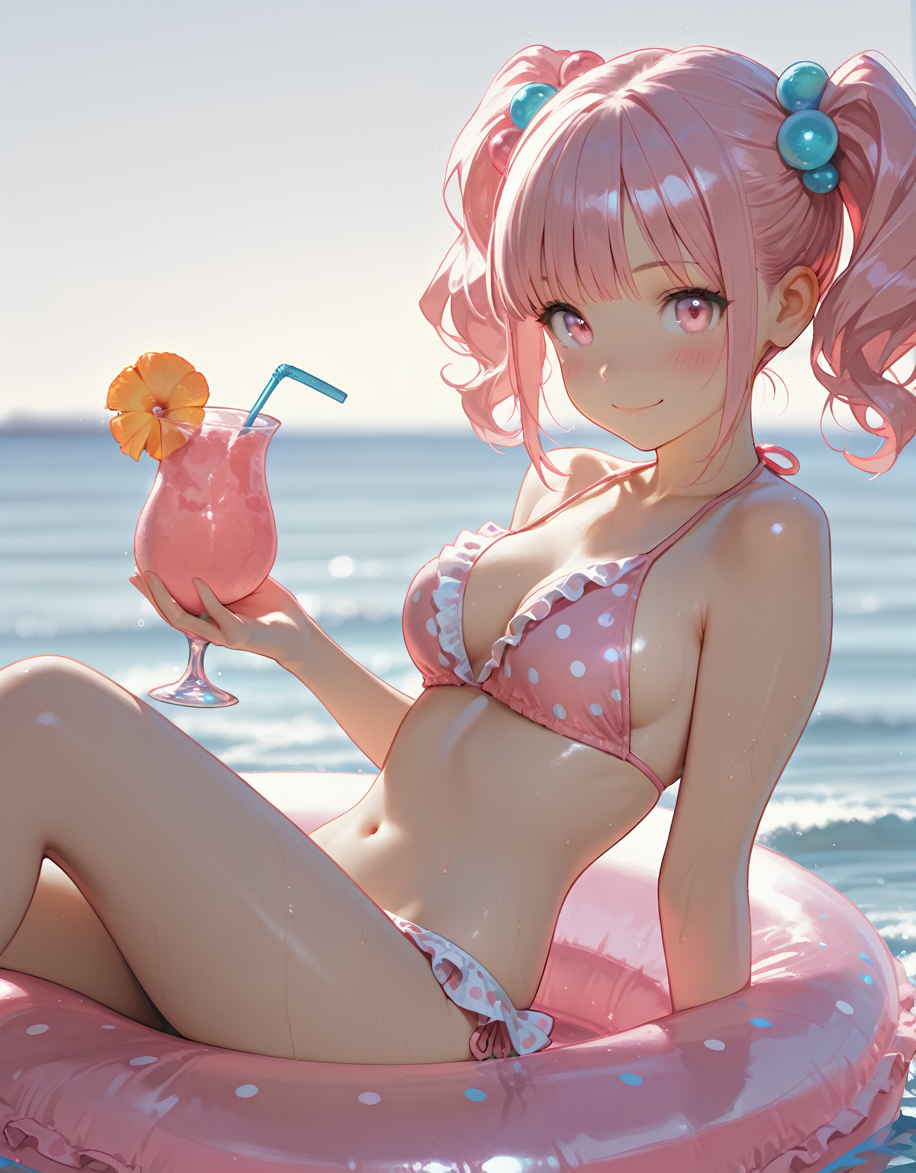 (frilly string bikini:1.4), (pinku Polka dot:1.2), bare foot, BREAK Two straws, (holding a Tropical cocktails:1.2), sitting on floating innertube, sea,