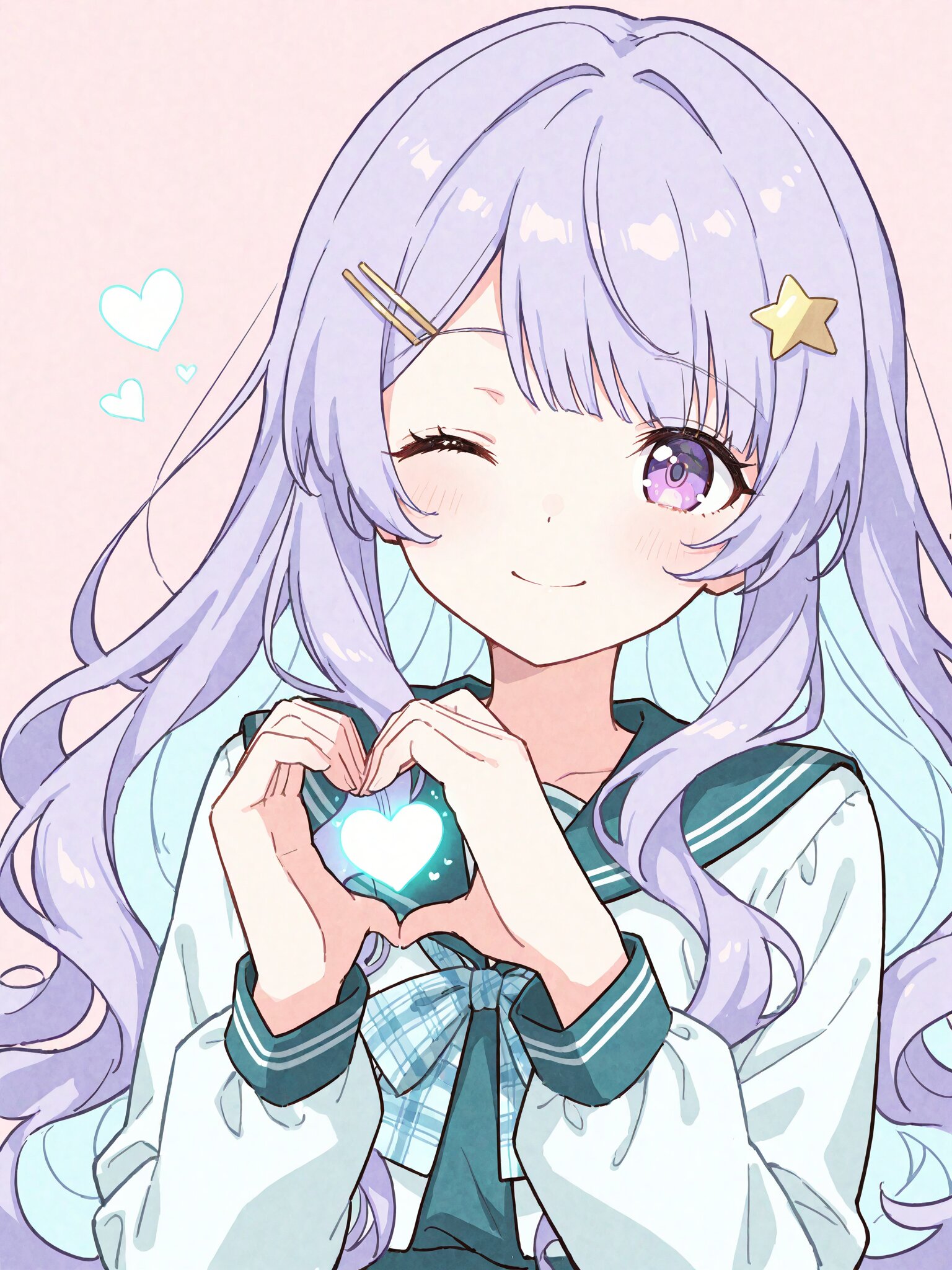 masterpiece, best quality, solo, upper body, making a heart with hands, one eye closed, charming smile, school uniform with white blouse and plaid ribbon, soft pink background with hearts, cute anime girl, long wavy hair with soft inner curls, purple eyes, pastel color scheme, gentle lighting, glowing skin, charming expression, light makeup, anime style purple hair with light blue inner color, star hairpin, elegant and kind atmosphere, soft anime face, teenage, pastel purple hair, (light blue inner hair:1.3), fluffy long hair, loosely wavy hair, soft flowing hair, straight-cut bangs, star-shaped hairpin, calm violet eyes,, masterpiece, best quality, soft pastel color palette, thin delicate lineart, pale colors, watercolor texture, matte finish, subtle shading, minimal contrast,
