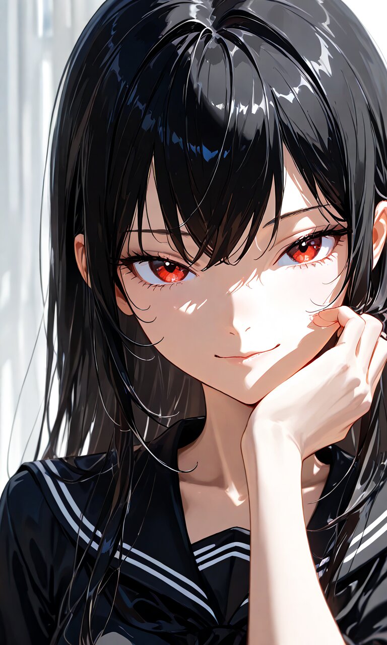 1 girl, seductive smile, red eyes, long hair, black hair, (black cloth, serafuku),