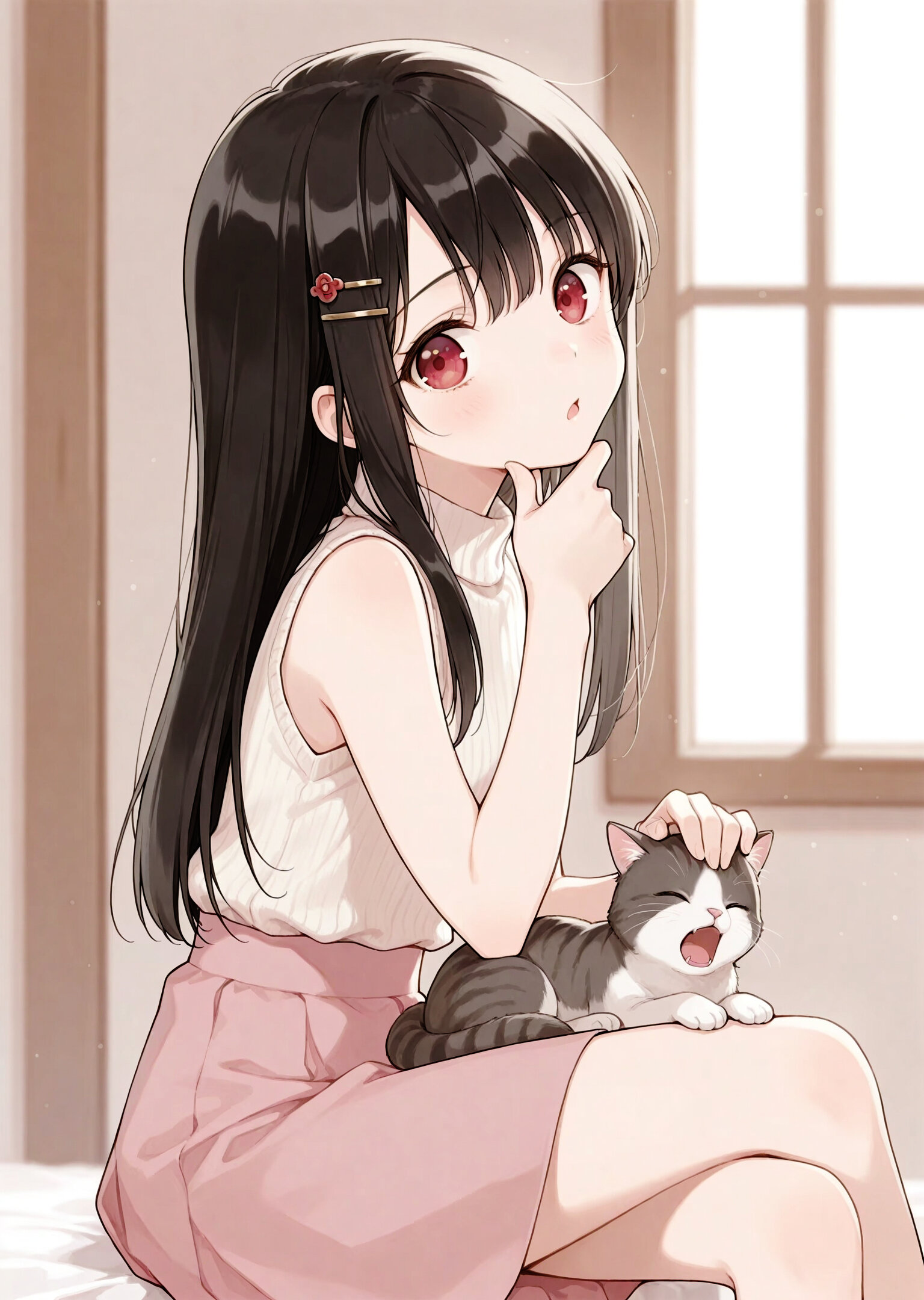 (flat color:0.1),(pale color:0.1), (tareme:0.33), cute 1girl , ruby eyes, straight hair ,black hair ,(bangs between eyes:0.5), hairpin,kawaii, (pastel theme :0.6), (depth of field:1.1), (bokeh:0.2), (head tilt:1.1), safe, general, BREAK yawning cat, closed eyes, petting cat , sitting, playful cat , paw up, lineup, thinking, (stroking own chin:1.3), sleeveless sweater, pink skirt, waist ,crossed legs, contrapposto, ( from side:0.3) , refined novel illustration,