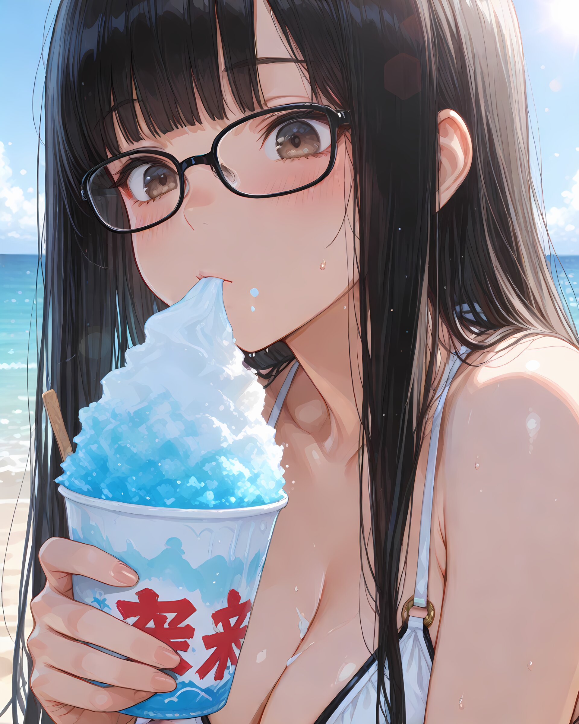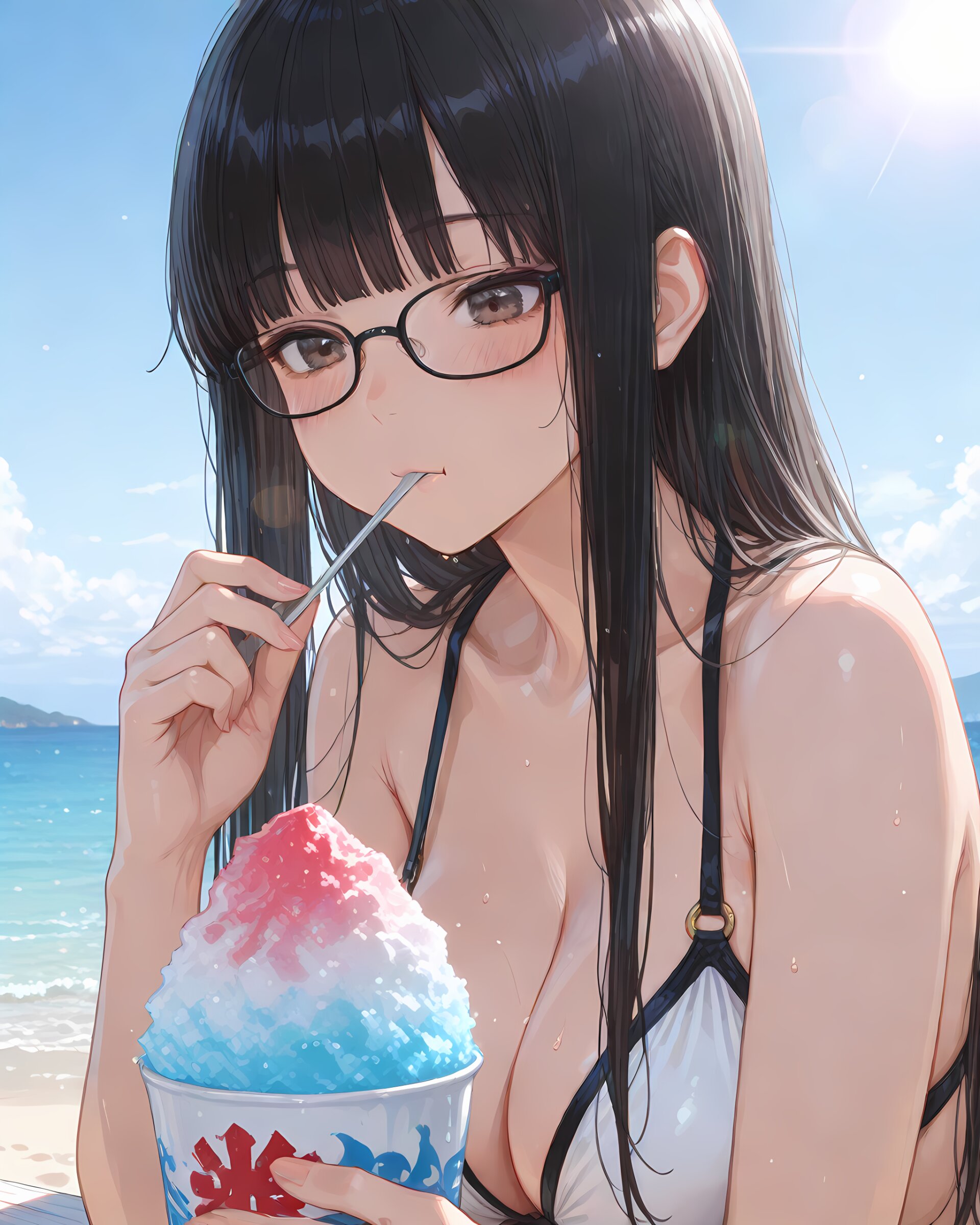 <lora:hyper_sdxl_8_step_lora_f16:1>,, 1girl, eating shaved ice cream , seaside, outdoors, day, sun, lens flare, close up, focus face, BREAK 18 years old, girl, long straight black hair, blunt bangs, large breasts, cleavage, bikini swimsuit, glasses, blush, BREAK masterpiece, amazing quality, best quality, ultra-detailed, 8K, Japanese,
