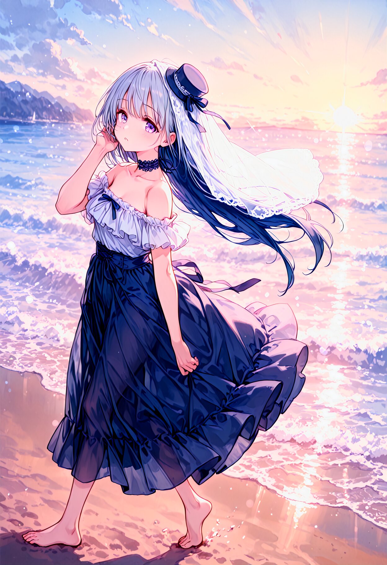 beautiful detailed background, best quality, (pale color:0.8), (pastel colors,:0.5), scenery, detailed, intricate, evening, sea,beach, walking, (full body, portrait, :0.7), collarbone, parted lips,(Expressionless:0.8), big eyes,(half-closed eyes:0.8), tareme, pale purple eyes, (silver hair:1.1), (dark blue hair colored inner hair:0.8), long hair,very long hair eyebrows visible through hair, (white off-shoulder:1.1) and dark blue skirt, see-through veil, mini hat, blue strapping ribbon and bow, frills, strapping ribbon, choker, temptation, barefoot, from side, profile, looking at viewer, hand up,(head back,:0.6) intense angle, (lens flare,,:0.8) <lora:noline-16oa:-0.9> <lora:sdxl2-flat2-512b:-0.8> <lora:sdxl-shadow_01:-0.6>