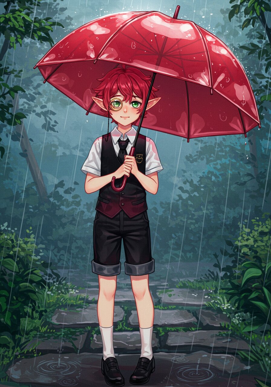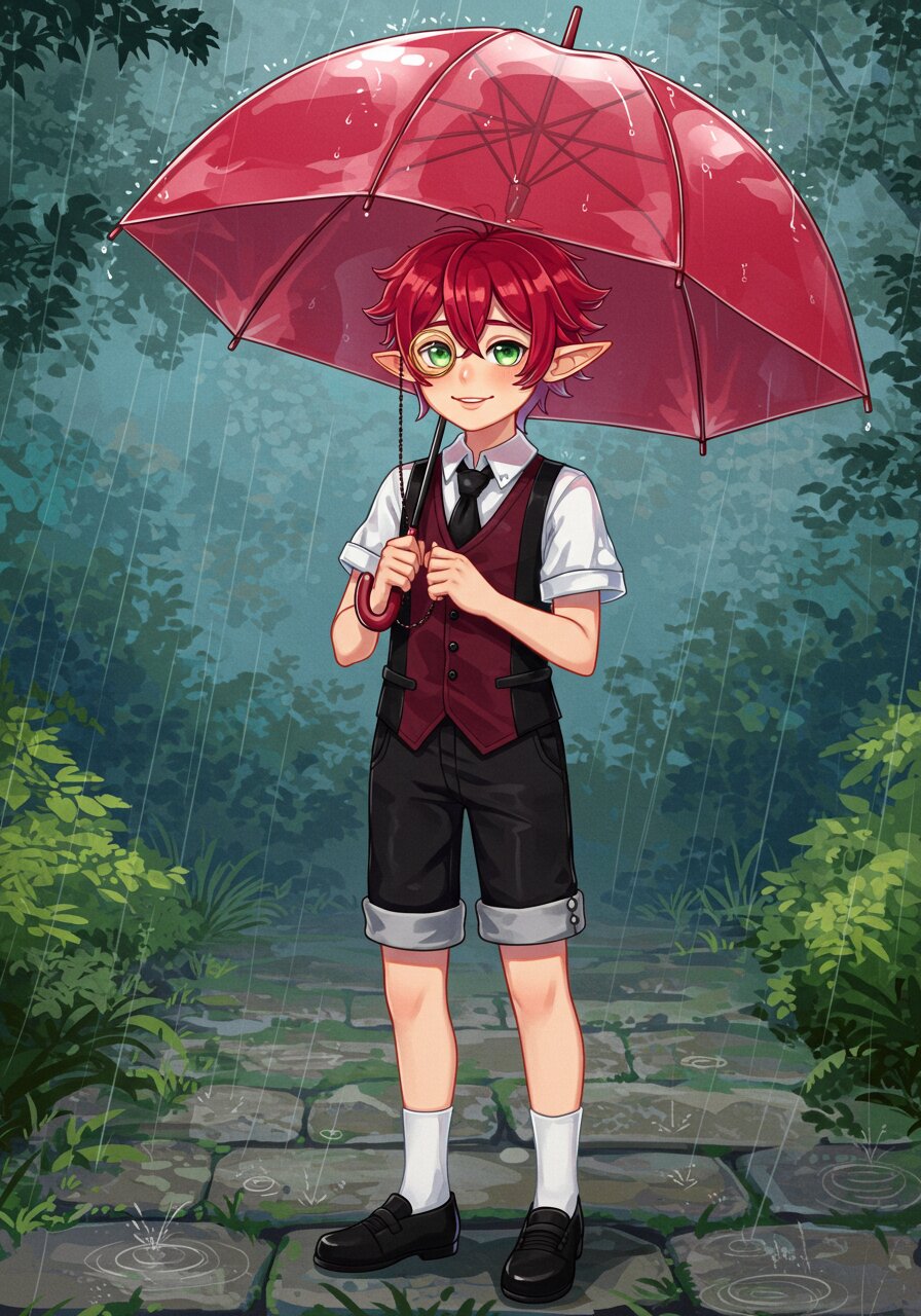 A young, elf-eared boy with fluffy, vibrant red hair styled similarly to Ragatha from "The Amazing Digital Circus". His left eye is covered with a monocle. He has gentle green eyes and a shy, innocent-looking face, now softened by a cheerful, light smile—as if he’s quietly enjoying the rainy day. He wears a short-sleeved white shirt with a black necktie, and a fitted vest with a black front panel and dark red (maroon) side panels. He also wears black shorts with the cuffs rolled up to reveal white lining. His outfit is completed with white socks and black shoes. He is holding a stylish, semi-transparent red vinyl umbrella above his head. The umbrella’s color matches his hair, adding a vivid accent to the scene. The background shows a gentle rain falling in a cool, misty natural setting—perhaps a quiet forest clearing or a mossy stone path surrounded by old trees. Rain droplets ripple in shallow puddles, and the soft light filtering through the clouds and leaves creates a fresh, serene, and slightly magical atmosphere. Full body, standing pose. The art style is semi-realistic anime, with soft shading, moisture effects, and detailed fabric textures.