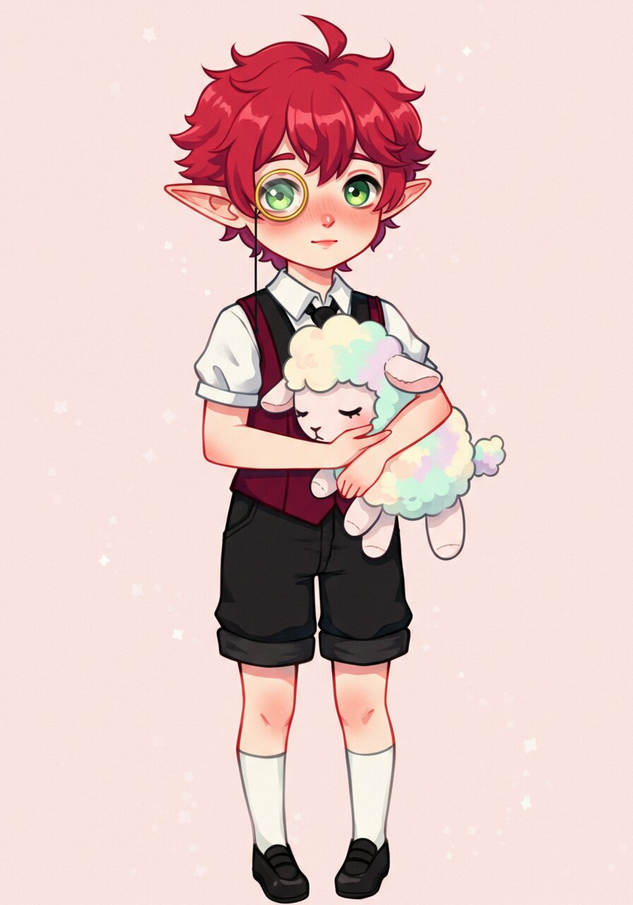 A young, elf-eared boy with fluffy, vibrant red hair styled similarly to Ragatha from "The Amazing Digital Circus". His left eye is covered with a monocle. He has gentle green eyes and a shy, innocent-looking face. He wears a short-sleeved white shirt with a black necktie, and a fitted vest with a black front panel and dark red (maroon) side panels. He also wears black shorts with the cuffs rolled up to reveal white lining. His outfit is completed with white socks and black shoes. In his arms, he is gently holding a plush stuffed animal—a sleeping sheep designed in soft, pastel "yume-kawa" colors like baby pink, lavender, mint, and cream. The sheep has closed embroidered eyes and a fluffy, curled body, evoking a sense of peaceful dreams. His expression is calm and slightly protective, as if the plush toy is something precious to him. Full body, standing pose. The art style is semi-realistic anime, with soft shading, delicate textile detailing, and a dreamy, soothing atmosphere.