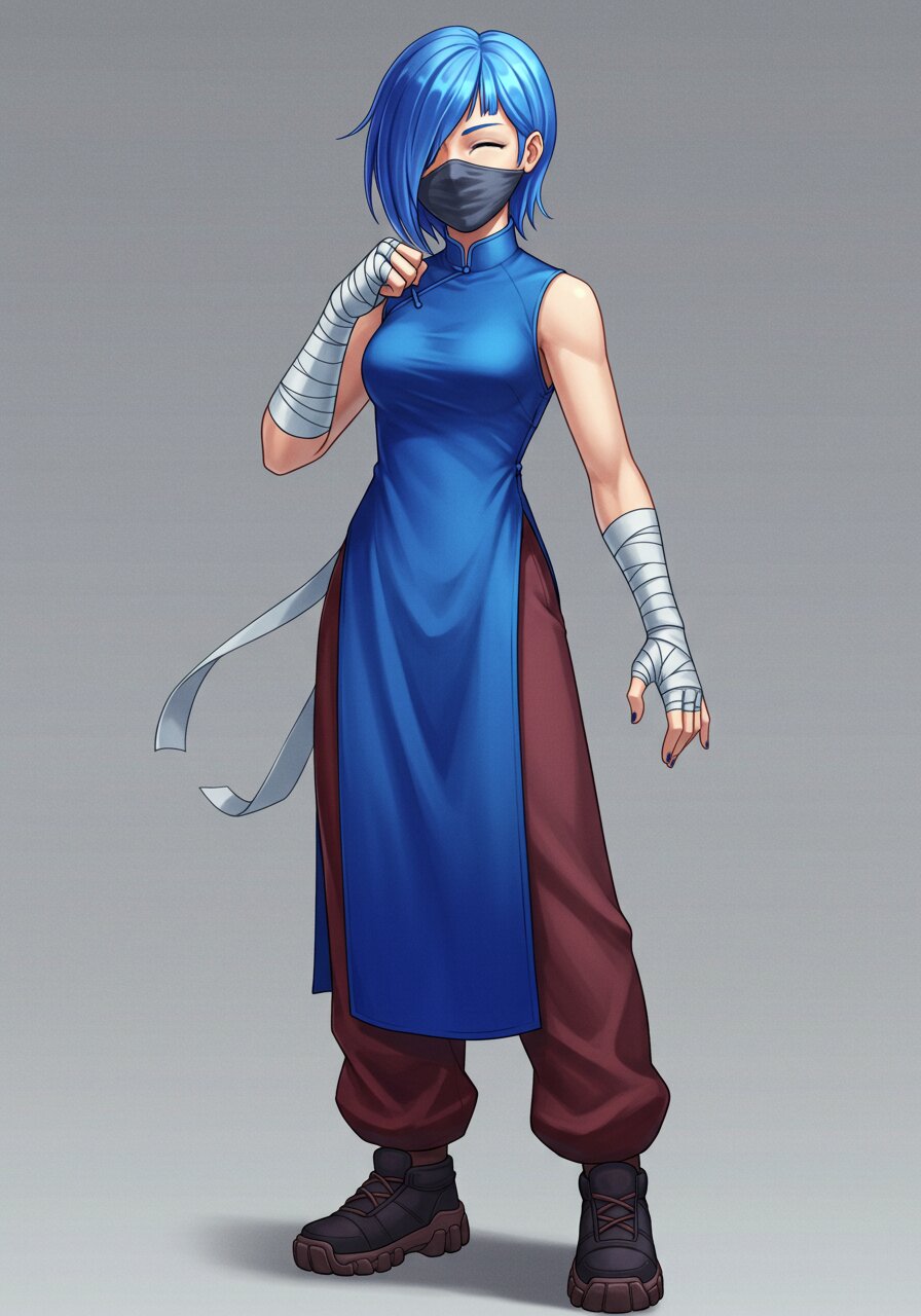 A confident young woman with short, vivid blue hair that gradually fades to light blue at the tips. Her hairstyle includes long front bangs that fully cover her left eye in a clean, deliberate manner. Her right eye is softly closed in a calm, gentle smile — a natural "ito-me" expression — with the curved shape of her eyelid clearly visible. Neither eye is visible directly: the left is hidden beneath her bangs, and the right is peacefully closed. Subtle pale pink eyeshadow softly blends with her skin, adding just a faint accent. Her arms are tightly wrapped with white martial-arts-style hand wraps and layered bandages extending from her forearms to her hands, worn in a functional, battle-ready manner. This wrapping is a key visual detail that emphasizes her physical discipline and fighter’s identity. She wears a sleeveless blue ao dai — a traditional Vietnamese dress — featuring elegant side slits and rendered with realistic fabric textures and gentle folds. Her pants are loose, reddish-brown, and slightly rugged in texture, paired with thick, heavy-soled black sneakers. Her fingernails are coated in a subdued blue polish. A matte black face mask conceals her mouth and nose, contributing to her composed and mysterious appearance. Her head is slightly tilted to the left to emphasize the concealment of her left eye. She stands upright in a full-body pose. The illustration is rendered in a semi-realistic anime style with a strong emphasis on realism: detailed fabric folds, natural lighting, subtle skin texture, and precise shading give the image a grounded and lifelike appearance.