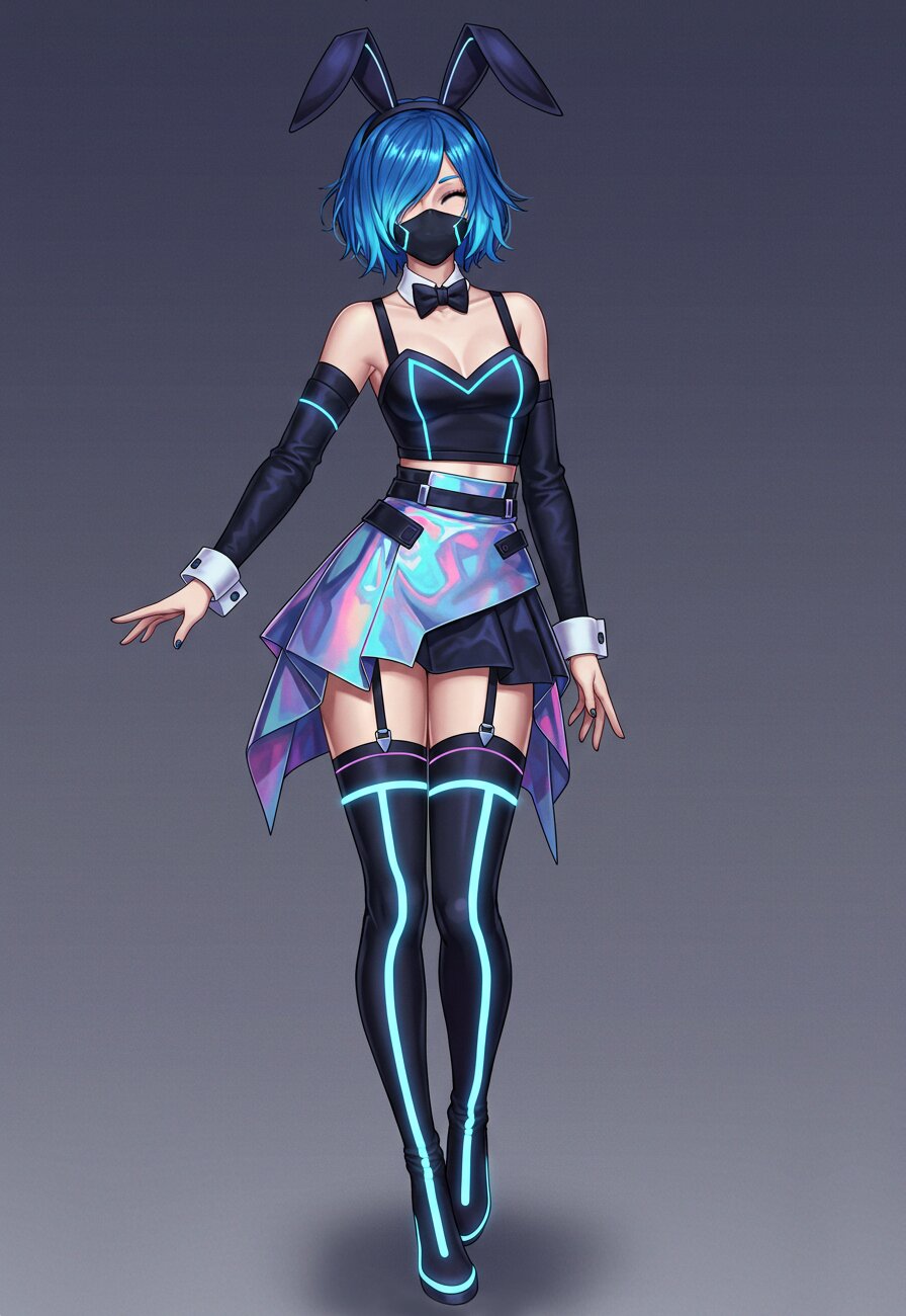 A confident young woman with short, vivid blue hair that gradually fades to light blue at the tips. Her hairstyle is deliberately asymmetrical and slightly messy, with long front bangs that clearly fall over the left side of her face, fully covering her left eye. These strands obscure her left eye in a natural and unforced way, creating a clear visual imbalance that is part of her signature look. Her right eye is gently closed in a soft, smiling "ito-me" expression. Neither eye is directly visible: one is hidden by hair, the other is peacefully closed. Her pale pink eyeshadow subtly blends with her skin. A matte black face mask fully covers her mouth and nose and is essential to her design. She wears a cyberpunk idol costume with feminine flair: a short, structured skirt with asymmetrical layers, soft metallic fabrics, and glittering holographic accents. On her head is a pair of tall, matte black bunny ears with subtle neon highlights. Her legs are slim and pale, partially covered by thigh-high boots with glowing trims. Her fingernails are painted a cool, subdued blue. She stands in a full-body pose, with her head tilted slightly to the left to accentuate the partial face concealment. The composition is centered and lit with soft studio lighting. The illustration style is semi-realistic, with detailed fabric textures and a balance of matte and holographic finishes.