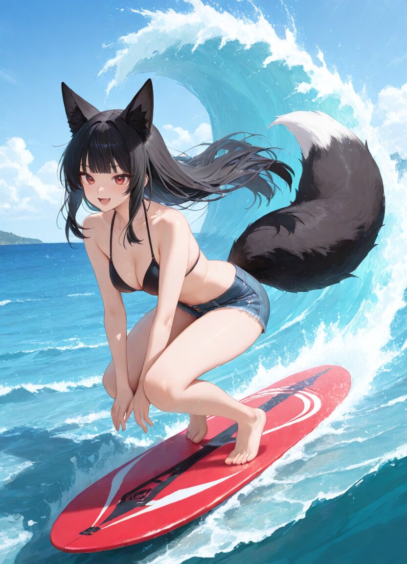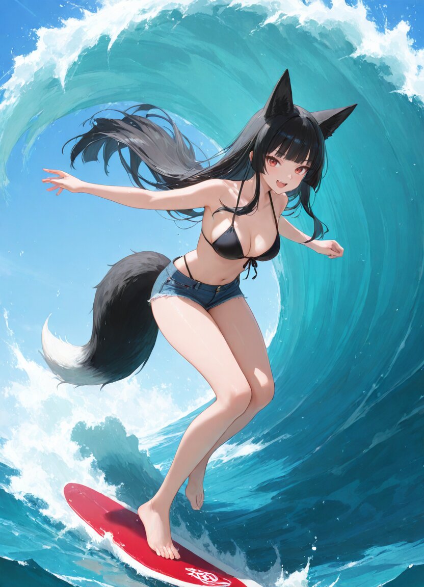 at ocean,huge wave,full body, 1girl,solo,:d,bikini,short pants,denim pants,surfing, <蓮華さん>,, appropriate posture,appropriate configuration,ideal ratio body proportions,perfect anatomy, <lora:Fixhands_anime_bdsqlsz_V1:1>, masterpiece,best quality,newest,absurdres,highres,ultra high res,8K UHD,hyper-detailed,