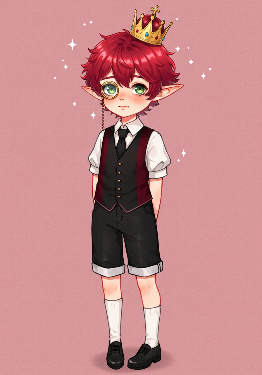 A young, elf-eared boy with fluffy, vibrant red hair styled similarly to Ragatha from "The Amazing Digital Circus". His left eye is covered with a monocle. He has gentle green eyes and a shy, innocent-looking face. He wears a short-sleeved white shirt with a black necktie, and a fitted vest with a black front panel and dark red (maroon) side panels. He also wears black shorts with the cuffs rolled up to reveal white lining. His outfit is completed with white socks and black shoes. He is wearing a slightly oversized, ornate crown that rests loosely atop his head, its size emphasizing his small stature and adding a whimsical, fairy-tale-like charm to his appearance. Full body, standing pose. The art style is semi-realistic anime, with soft shading and detailed fabric textures.