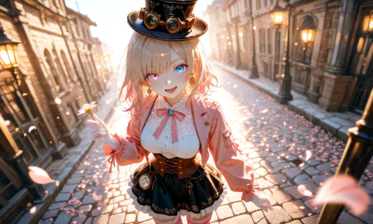 steampunk lolita dress, pink short jacket, open jacket, white blouse, black skirt, gold embroidery, Venetian lace, pink ribbon bow on chest, blue jeweled brooch, brown corset with brass buckles, layered frilled skirt with lace trims, white lace gloves, pink striped thigh-high stockings, brown leather boots, leather belt with pouches, vintage pocket watch, black top hat with attached goggles, brass gear earrings, zettai ryouiki,