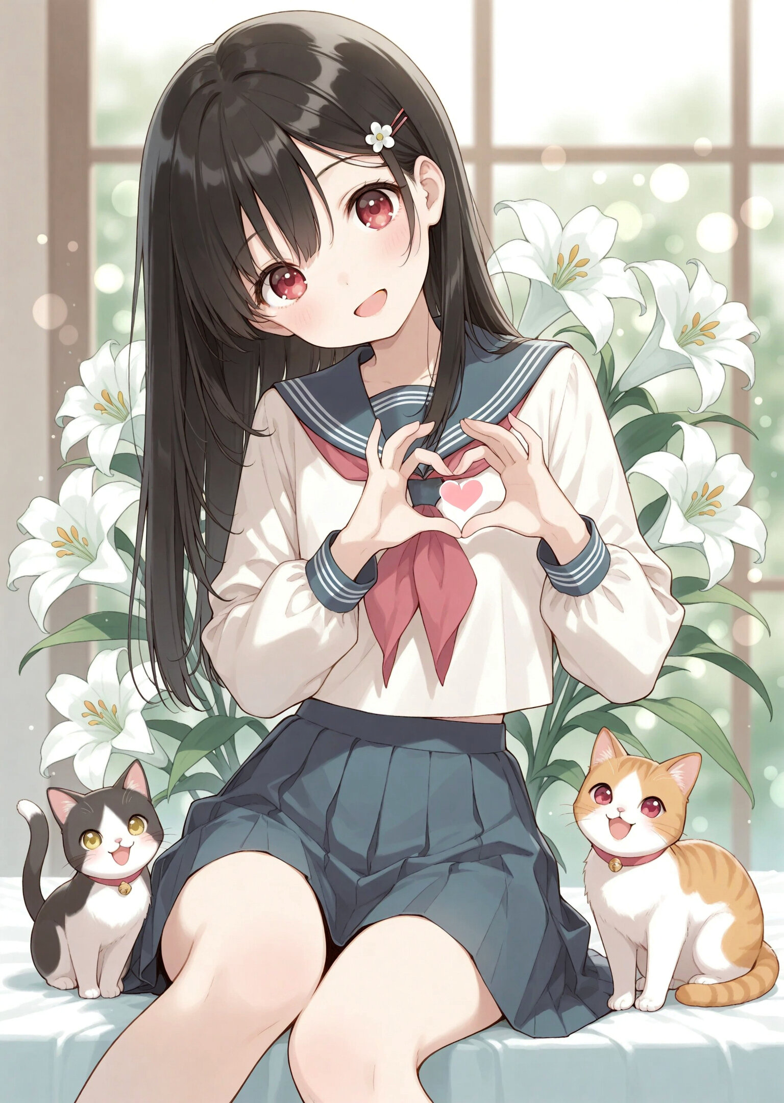 (flat color:0.1),(pale color:0.01), (tareme:0.33), cute 1girl is sitting, ruby eyes, straight hair ,black hair ,(bangs between eyes, asymmetrical bangs, swept bangs:0.8), hairpin,kawaii, (pastel theme :0.6), (depth of field:1.3), bokeh,excited, :d, (head tilt:1.1), safe, general, BREAK heart hands,2cats are sitting, playful cat , paw up, serafuku, pleated skirt,lily_(flower), waist ,a scrunchie, (contrapposto:1.1),flower in background, refined novel illustration