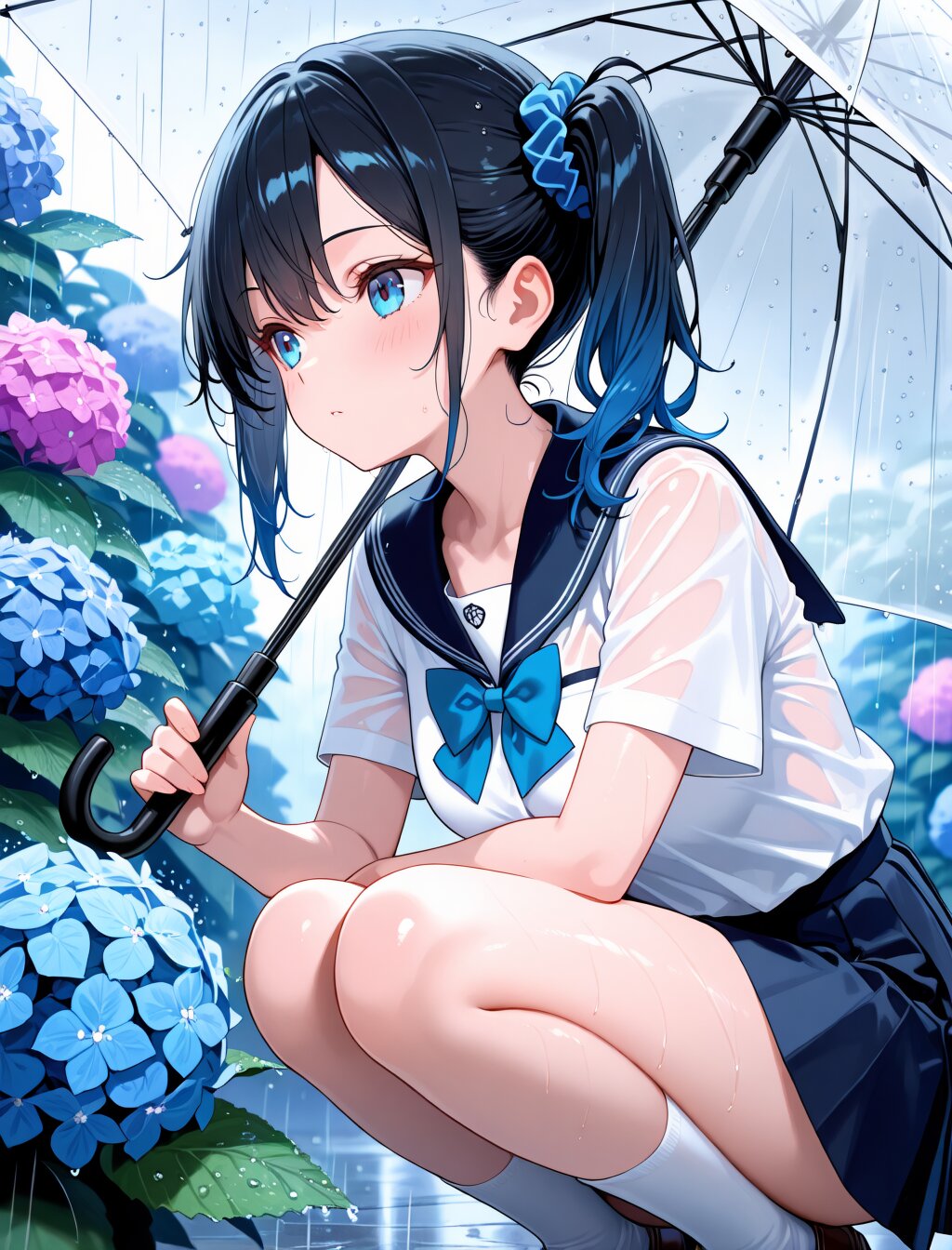 masterpiece,best quality,ultra detailed,1girl,solo,black hair,blue tips,(Side ponytail:1.2),blue eyes,blue_scrunchie, BREAK school uniform,short sleeve,rain,hydrangea,squatting,umbrella,