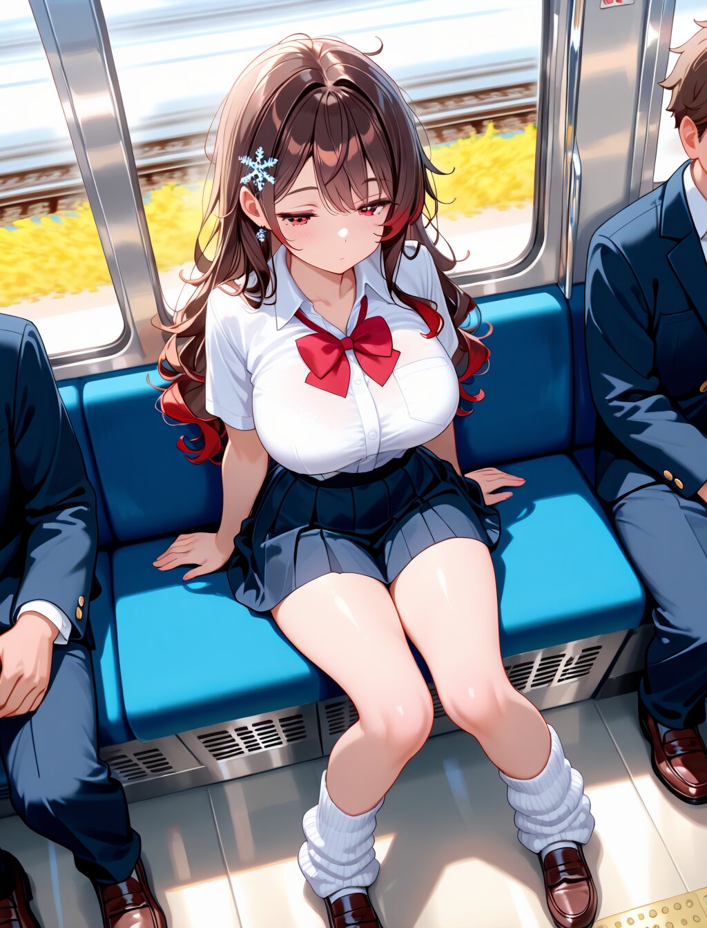masterpiece,best quality,ultra detailed,(1girl and 3boys:1.3),brown hair,red tips,red bow,wavy hair,long hair,red eyes,big breast,school uniform,short sleeve,loose socks,beautiful legs,beautiful thigh,snowflake_hair_ornament, BREAK train,sitting,sleepy,covering_mouth,from_above,panorama,selfy,