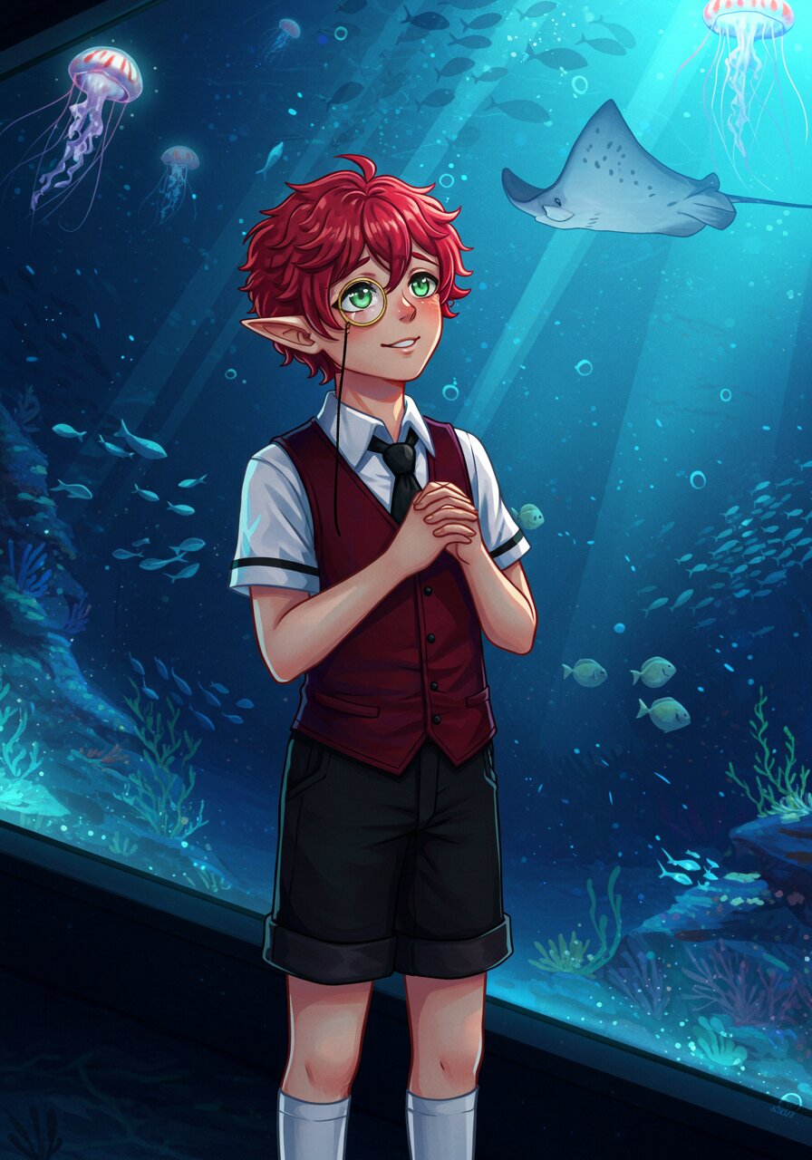 A young, elf-eared boy with fluffy, vibrant red hair styled similarly to Ragatha from "The Amazing Digital Circus". His left eye is covered with a monocle. He has gentle green eyes and a shy, innocent-looking face, now softened by a quiet, delighted smile. He wears a short-sleeved white shirt with a black necktie, and a fitted vest with a black front panel and dark red (maroon) side panels. He also wears black shorts with the cuffs rolled up to reveal white lining. His outfit is completed with white socks and black shoes. He is inside a large, dimly lit aquarium, surrounded by glowing blue light from massive glass tanks filled with jellyfish, rays, and shimmering schools of fish. He gazes up at the aquatic creatures in wonder, gently holding his hands together or leaning slightly toward the glass. His posture is relaxed, as if quietly savoring the moment. Full body, standing pose. The art style is semi-realistic anime, with soft shading, luminous water effects, and detailed fabric textures. The background adds an immersive, dreamlike underwater ambiance.