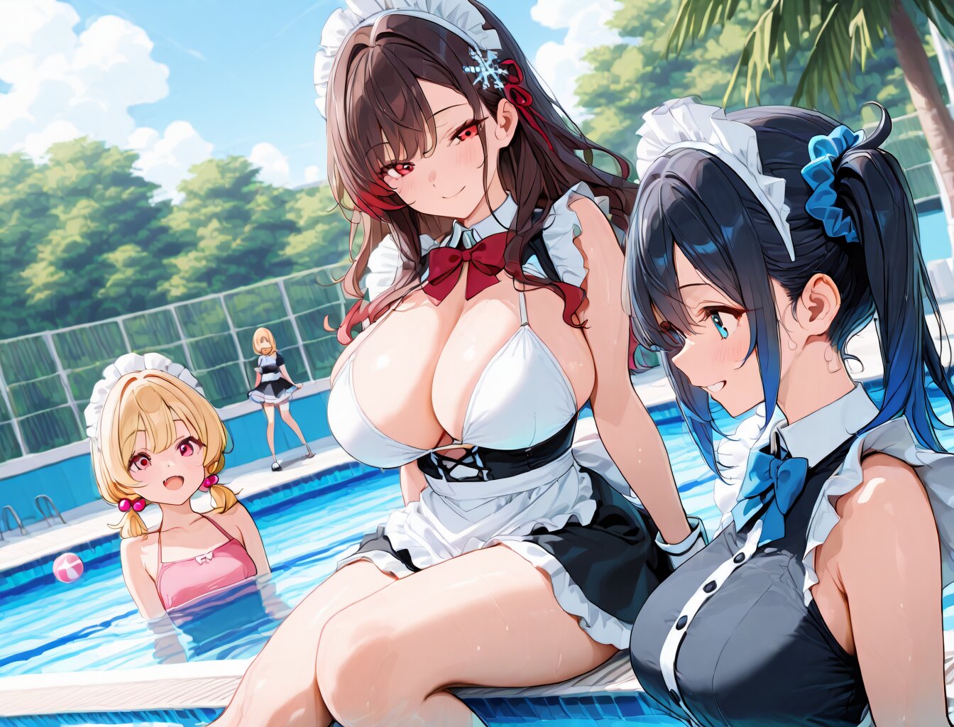 BREAK masterpiece,best quality,ultra detailed,(3girls:1.3), AND masterpiece,best quality,ultra detailed,(3girls:1.3),blonde hair,pink tips,pink bow,hair_bobbles,bob cut,(low twintails:1.2),(short twintails:1.2),pink eyes,fang,in summer,pool,(maid:1.5),soaking_feet, AND masterpiece,best quality,ultra detailed,(3girls:1.3),brown hair,red tips,red bow,wavy hair,long hair,red eyes,big breast,seductive_smile,snowflake_hair_ornament,in summer,pool,(maid:1.5),soaking_feet, AND masterpiece,best quality,ultra detailed,(3girls:1.3),black hair,blue tips,(Side ponytail:1.2),blue eyes,blue bow,blue_scrunchie,grin,in summer,pool,(maid:1.5),soaking_feet,