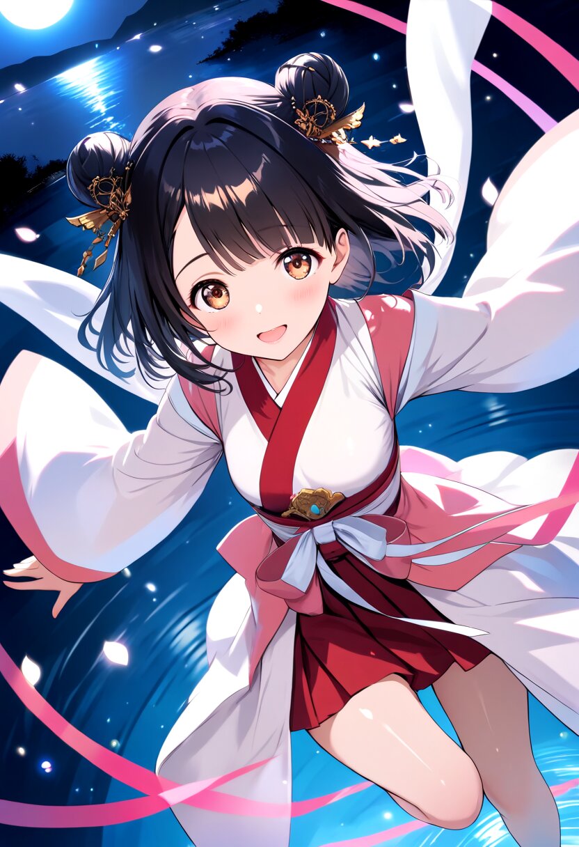 tanabata, 1girl, petite, cute, orihime, dark black hair, medium hair, straight hair, right diagonal bangs, double bun, small hair ornament, floating hair, tareme:1.4, beautiful brown eyes, beautiful lips, pink lips, glossy lips, half open mouth, smile, blush, maxi kimono, hagoromo, hangover, floating clothes, medium breasts, zori, spread arms, standing on one leg, flying on water, ripples, aura, dutch angle, straight-on, night, moonlight, lake, bokeh:1.4, Dreamy Blur, light particles, light leaks,