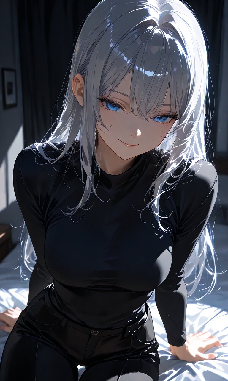 1 lady, blue eyes, long hair, silver hair, breasts,(black shirt, black pants), , seductive smile, dark room