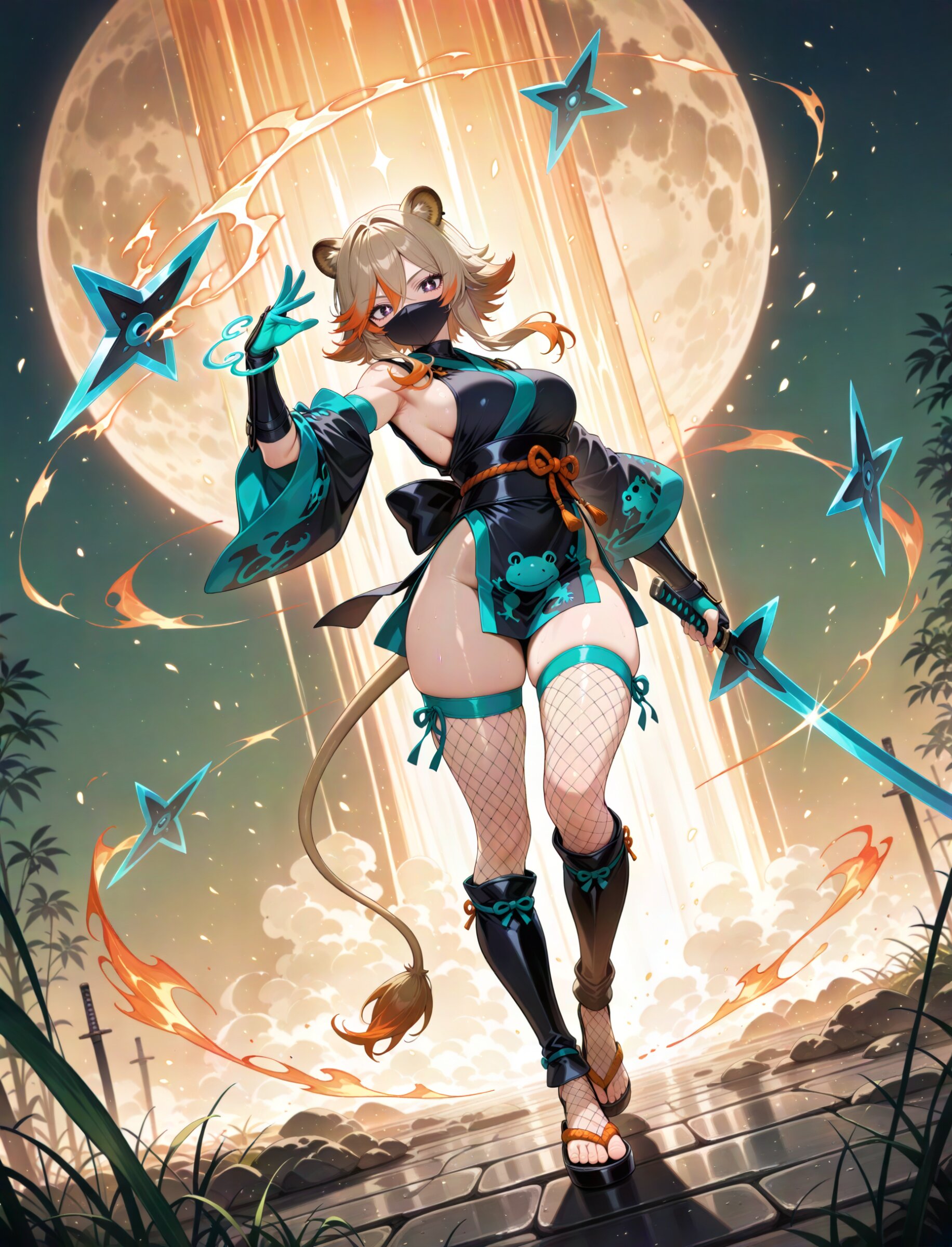 super fine concept art, hard surface, 8K, masterpiece, best quality, amazing quality, very aesthetic, absurdres, foreshortening, (face:1.2) , (dutch angle:1.2), The silhouette is composed of dynamic, Frog print and vibrant rectangle. The background is a solid, creating a striking contrast with the intricate, multi-colored design of the character, summer atmosphere. 1girl, samurai, (muscular female:0.65), beige hair, orange colored tips, shoulder length hair, flipped hair medium bangs , dyed bangs, blight pupils, beautiful black eyes beautiful breasts, ,, ninja cloth, short kimono, obijime, fishnet inner, fishnets, fishnet thighhighs, ninja pants,, kote, (ninjutsu:1.1), (wearing big shuriken:1.1) black mask, , sideboob, zouri, ninja pants, lion ears, lion tail, ,, japanese clothes, seductive smile, dynamic pose, kung fu attack, kung fu action, kuji-in, ninjutsu, floating weapon, tantou, henshin, transformation, smoke, (swirling ink effects:1.2) dynamic action, , The background is a solid, bright cobalt green, creating a striking contrast with the intricate, multi-colored design of the character, (a lot of silhouette:1.0), pop color background, (high saturation:1.2), summer coloring, partly black ink wash effect, professional art lots of details, , overexposure, sumie effect style, 4ur4_illu,shiny, glowing, glowing particles, glowing light particles, light particles, flame cobalt green, <lora:noline (1):-0.5> <lora:sdxl2-flat2-512b:-0.2> <lora:facelightup_xl_v10:0.5> <lora:V2_yakumo_alchemy:0.5> <lora:Aura_illu:0.1>