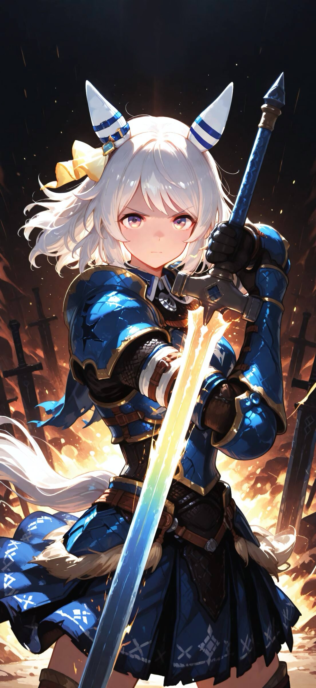 Hishi Miracle (Umamusume), unlimited blade works background, cowboy shot, horse ear, horse tail, dynamic pose, looking at viewer, skirt, armor, monster hunter costume, holding great sword, serious expression, attack motion, white hair, dramatic lighting, wind effects, flowing fabric, detailed sword design, battle-ready stance, energy particles, vivid colors, intense atmosphere