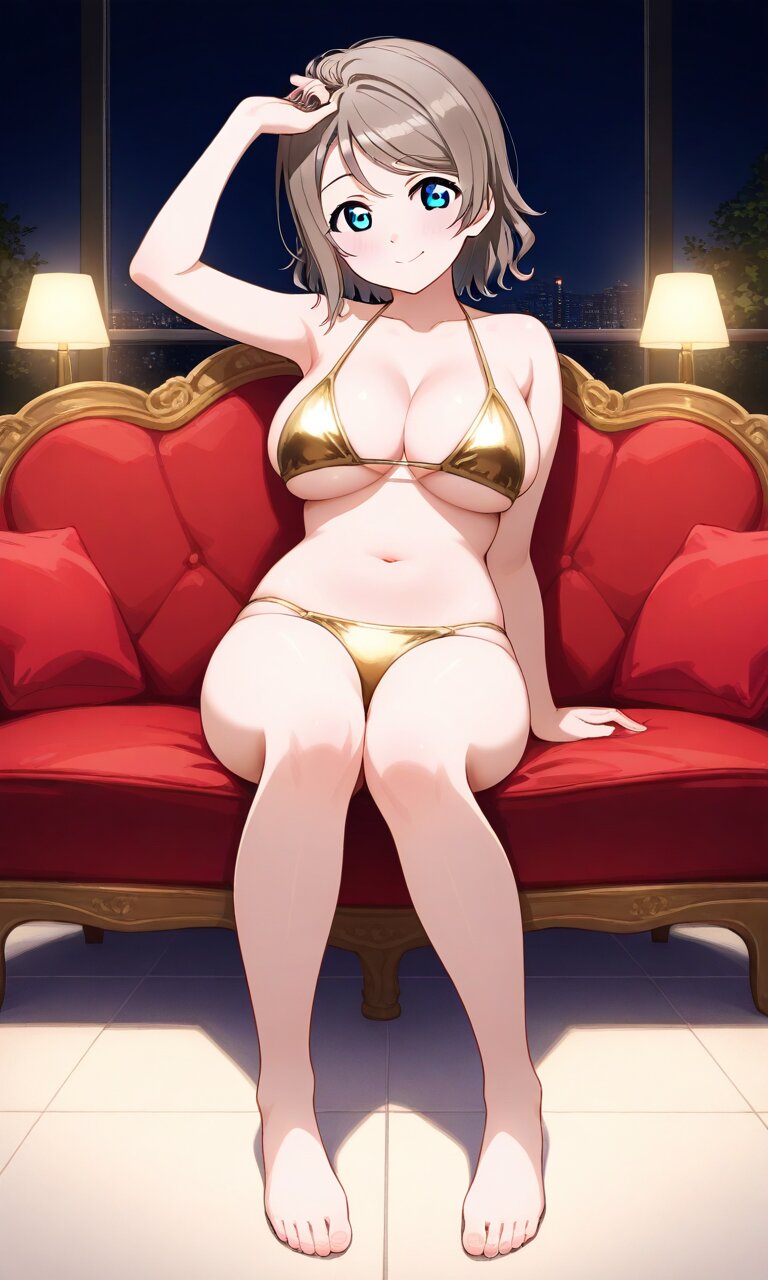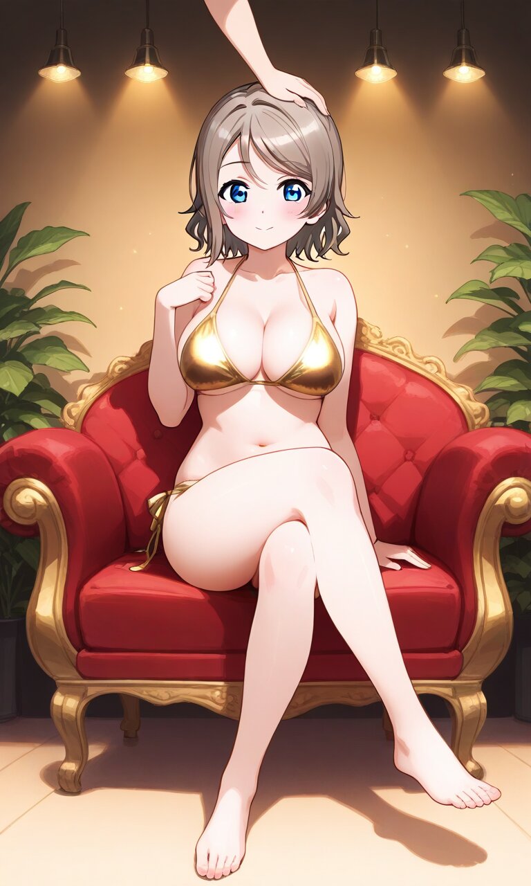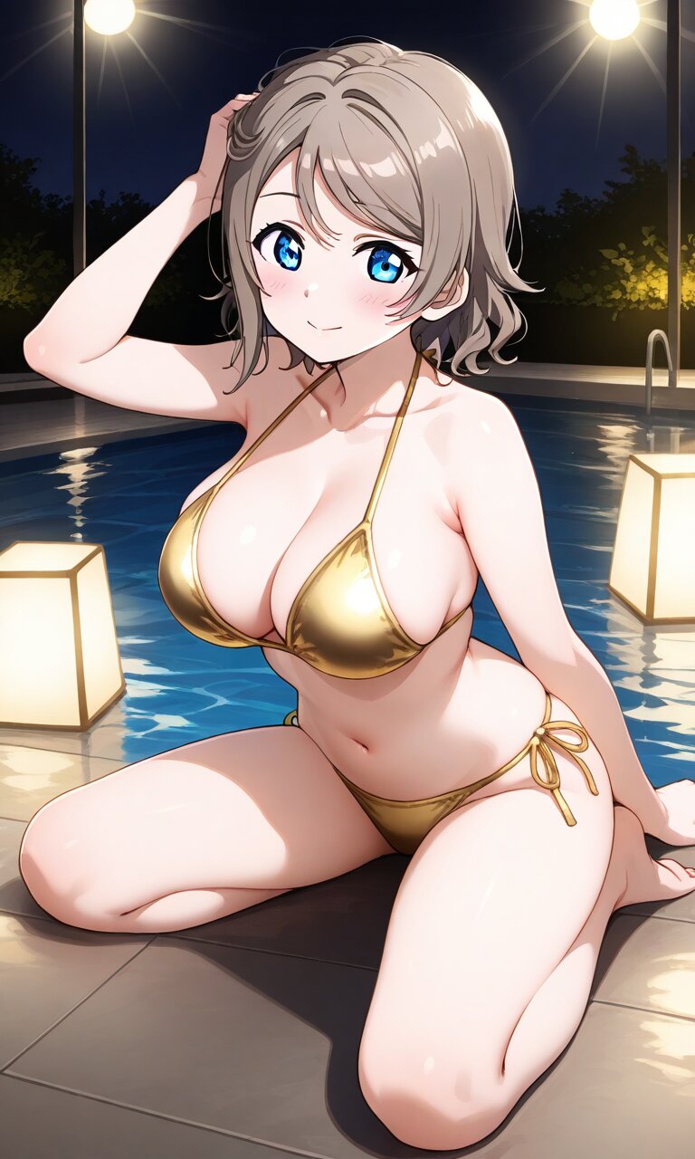 you watanabe, blue eyes, brown hair, short hair, swept bangs, large breasts, best quality}, {very aesthetic}, {ultra-detailed}, {best illustration} nsfw, perfect hands, perfect face, perfect eyes, perfect light, dynamic light, natural light, full body A sultry gravure idol in a gold bikini, lounging on a plush velvet chaise by a poolside at dusk. She lies on her side, one arm propping her head, the other draped along her curves, with a smoldering gaze and soft pool lights reflecting off her skin