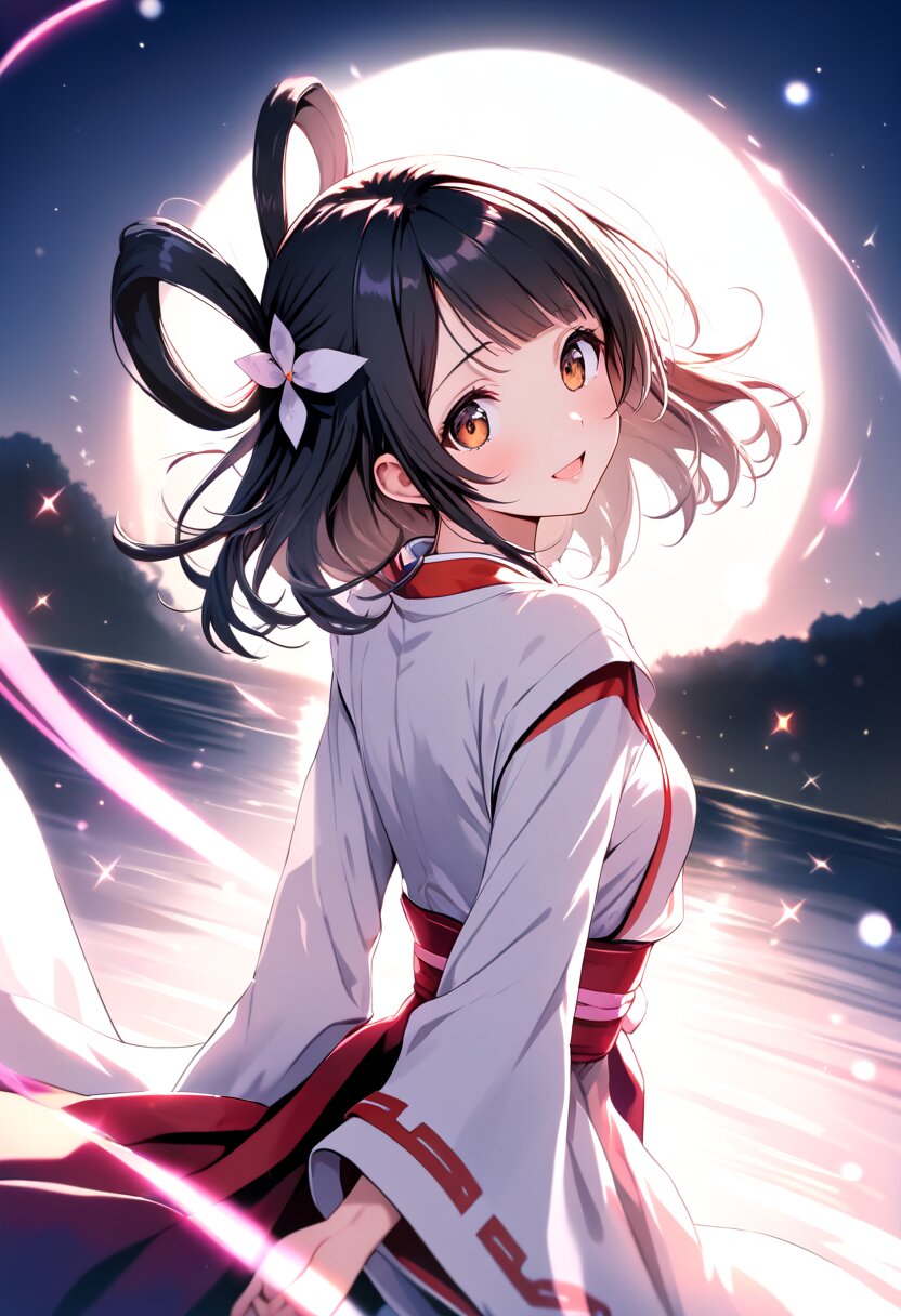 1girl, petite, cute, orihime, dark black hair, medium hair, straight hair, right diagonal bangs, hair rings, small hair ornament, floating hair, tareme:1.4, beautiful brown eyes, looking back, beautiful lips, pink lips, glossy lips, half open mouth, smile, blush, maxi kimono, hagoromo, hangover, floating clothes, medium breasts, zori, arms behind back, aura, dutch angle, from behind, Basking in a divine light, night, moonlight, lake, ripples, bokeh:1.4, Dreamy Blur, light particles, light leaks,