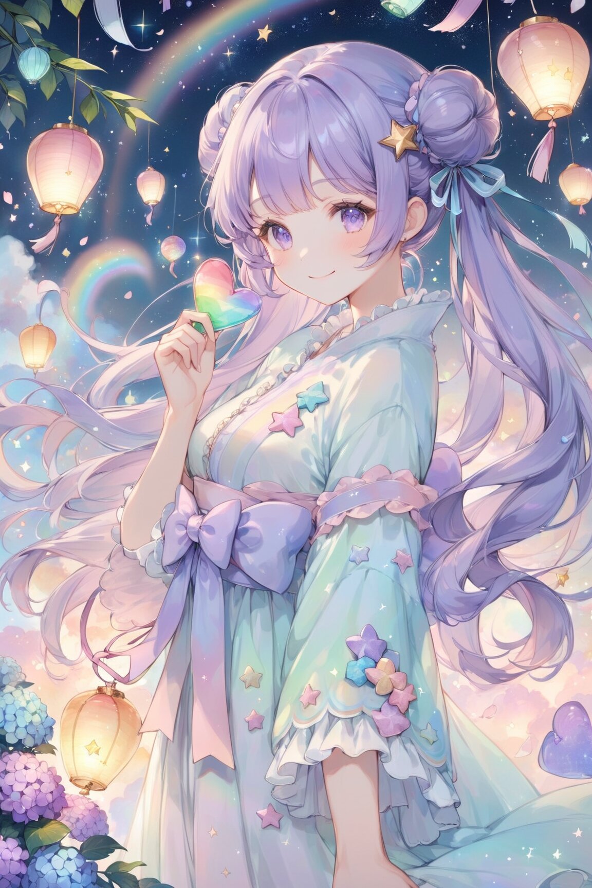 masterpiece, best quality, solo, upper body, cute anime girl with a bright joyful smile, holding a colorful Tanzaku (wish tag), wearing a pastel yukata with hydrangea and star patterns, soft purple and white color scheme, long silky purple hair with light blue inner highlights styled in twin buns, sparkling purple eyes, standing under a bamboo branch decorated with wishes and streamers, surrounded by floating translucent candy-like stars and dreamy pastel wagashi (Japanese sweets), softly glowing jellyfish-shaped candy lights, sparkles and ribbons, magical dreamy festival night, soft glowing paper lanterns in background, pastel sky with faint stars, soft ambient glow, thin delicate lineart, watercolor texture, fluffy atmosphere, subtle rainbow light, masterpiece, best quality, soft pastel color palette, thin delicate lineart, pale colors, watercolor texture, matte finish, subtle shading, minimal contrast,, pastel color palette, soft glow, sparkles, floating petals, fluffy textures, star motifs, heart motifs, translucent fabric, soft frills, magical atmosphere, gentle light, dreamy background, faint clouds, cute accessories, subtle rainbow tones