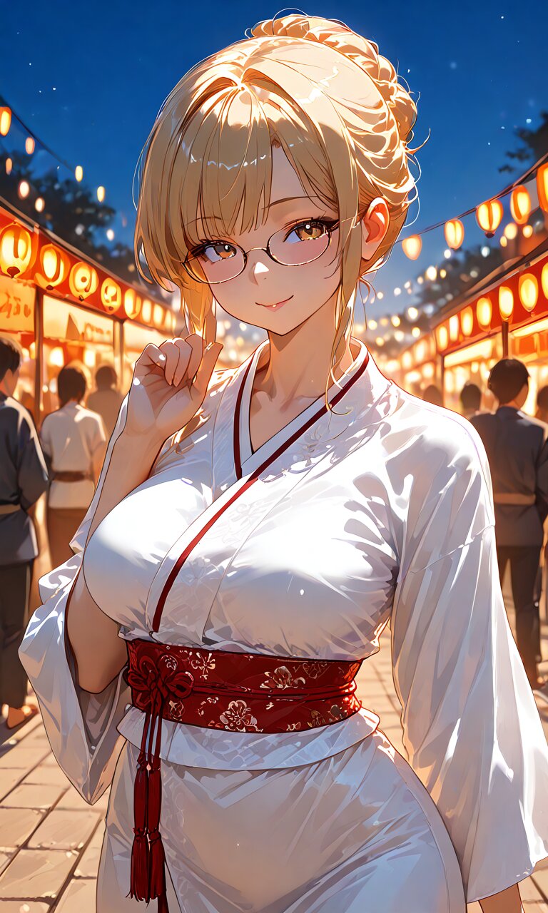1 lady, hair bun, blonde hair, glasses, breasts,(Japanese cloth, festival), blush, smugness, cowboy shot, smile,